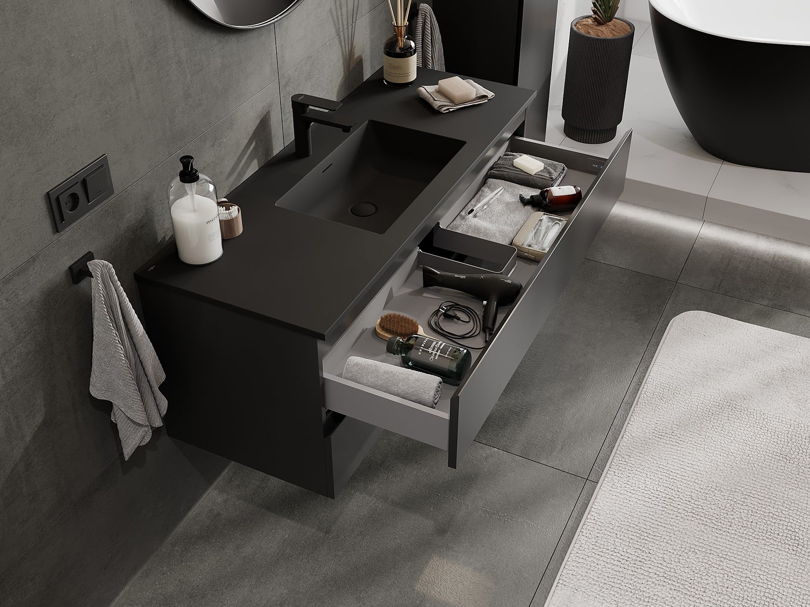 Η εγκοπή στο συρτάρι είναι σχεδιασμένη με τέτοιο τρόπο, ώστε να φιλοξενεί το σιφόνι, το οποίο είναι απαραίτητο στις εγκαταστάσεις νιπτήρων. Έτσι, το έπιπλο μπορεί να εγκατασταθεί πλήρως λειτουργικά, χωρίς την ανάγκη παραίτησης από χώρο στο συρτάρι υπέρ της εγκατάστασης.