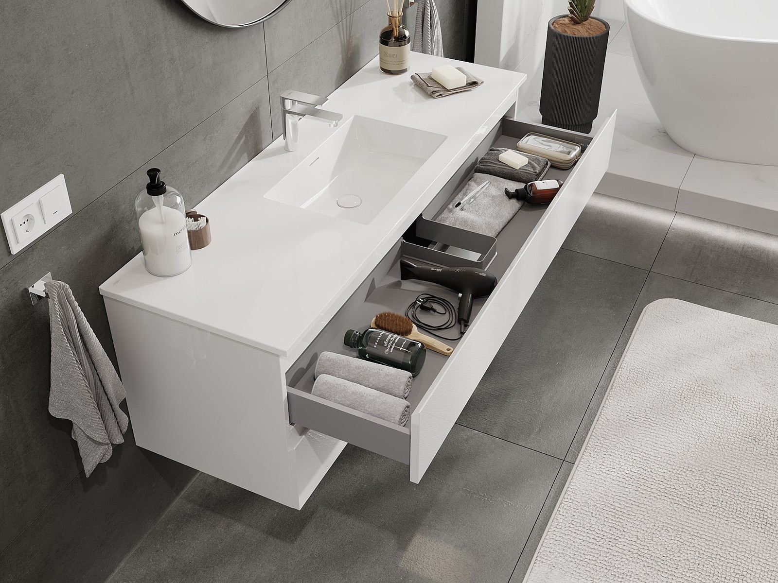 Η εγκοπή στο συρτάρι είναι σχεδιασμένη με τέτοιο τρόπο, ώστε να φιλοξενεί το σιφόνι, το οποίο είναι απαραίτητο στις εγκαταστάσεις νιπτήρων. Έτσι, το έπιπλο μπορεί να εγκατασταθεί πλήρως λειτουργικά, χωρίς την ανάγκη παραίτησης από χώρο στο συρτάρι υπέρ της εγκατάστασης.