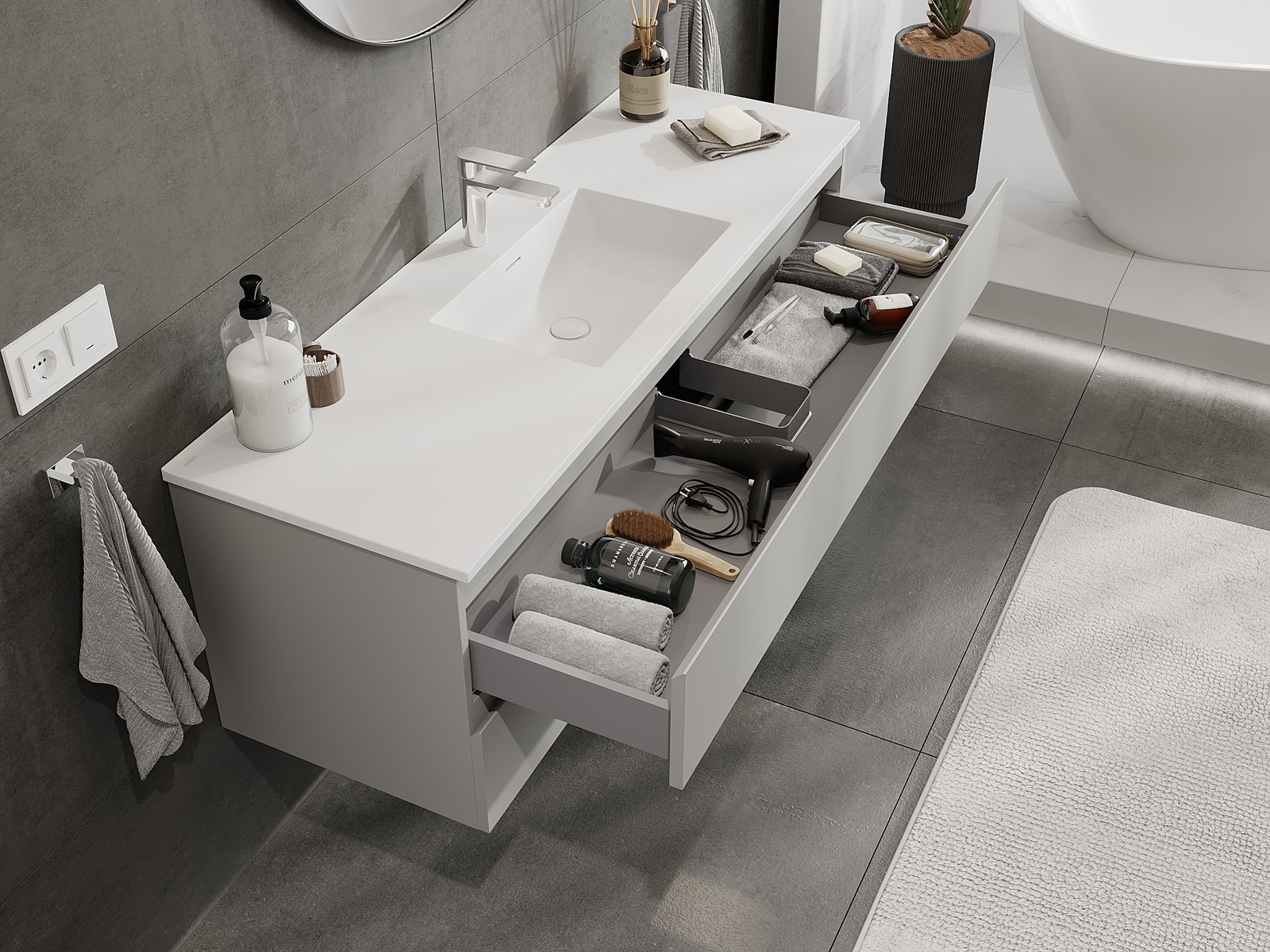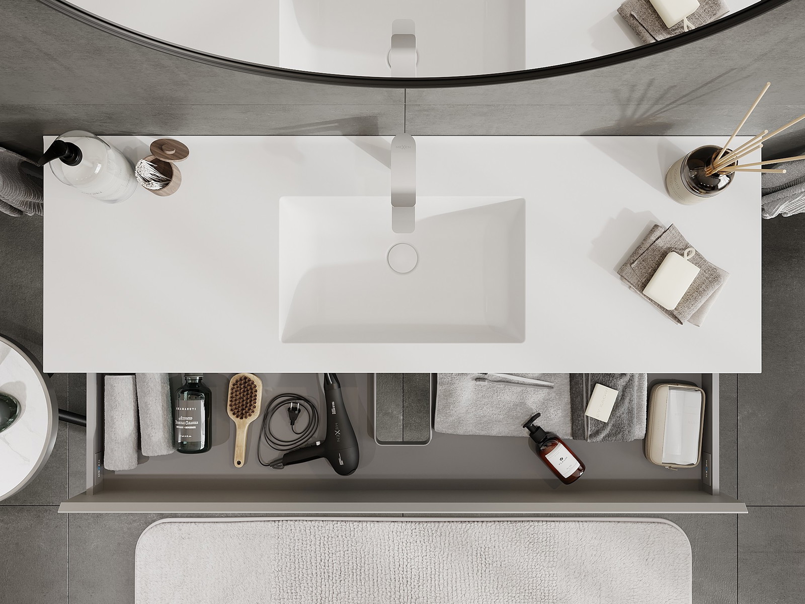 Η εγκοπή στο συρτάρι είναι σχεδιασμένη με τέτοιο τρόπο, ώστε να φιλοξενεί το σιφόνι, το οποίο είναι απαραίτητο στις εγκαταστάσεις νιπτήρων. Έτσι, το έπιπλο μπορεί να εγκατασταθεί πλήρως λειτουργικά, χωρίς την ανάγκη παραίτησης από χώρο στο συρτάρι υπέρ της εγκατάστασης.