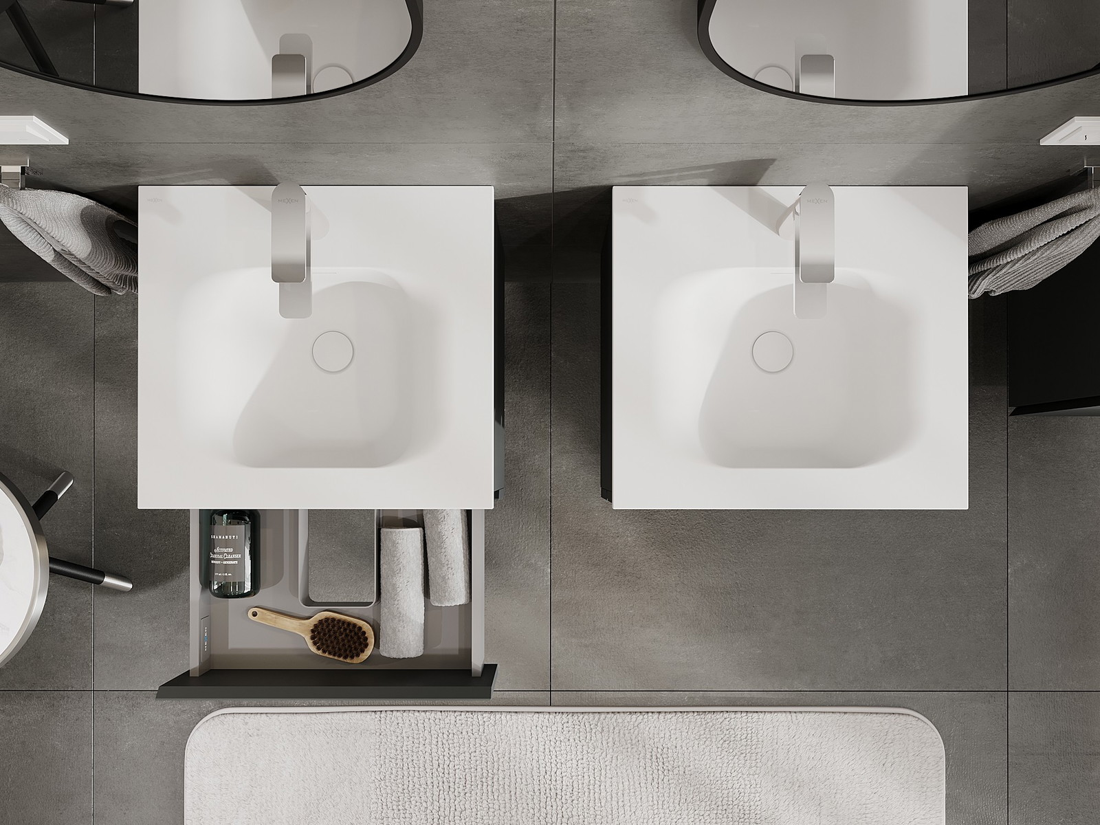 Η εγκοπή στο συρτάρι είναι σχεδιασμένη με τέτοιο τρόπο, ώστε να φιλοξενεί το σιφόνι, το οποίο είναι απαραίτητο στις εγκαταστάσεις νιπτήρων. Έτσι, το έπιπλο μπορεί να εγκατασταθεί πλήρως λειτουργικά, χωρίς την ανάγκη παραίτησης από χώρο στο συρτάρι υπέρ της εγκατάστασης.