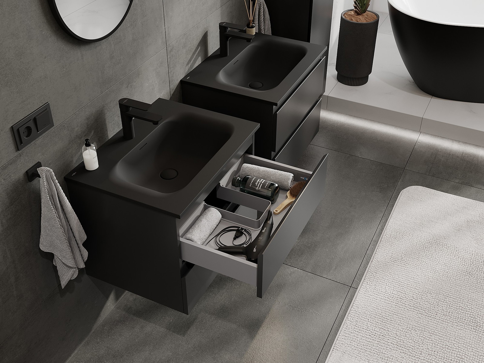 Η εγκοπή στο συρτάρι είναι σχεδιασμένη με τέτοιο τρόπο, ώστε να φιλοξενεί το σιφόνι, το οποίο είναι απαραίτητο στις εγκαταστάσεις νιπτήρων. Έτσι, το έπιπλο μπορεί να εγκατασταθεί πλήρως λειτουργικά, χωρίς την ανάγκη παραίτησης από χώρο στο συρτάρι υπέρ της εγκατάστασης.
