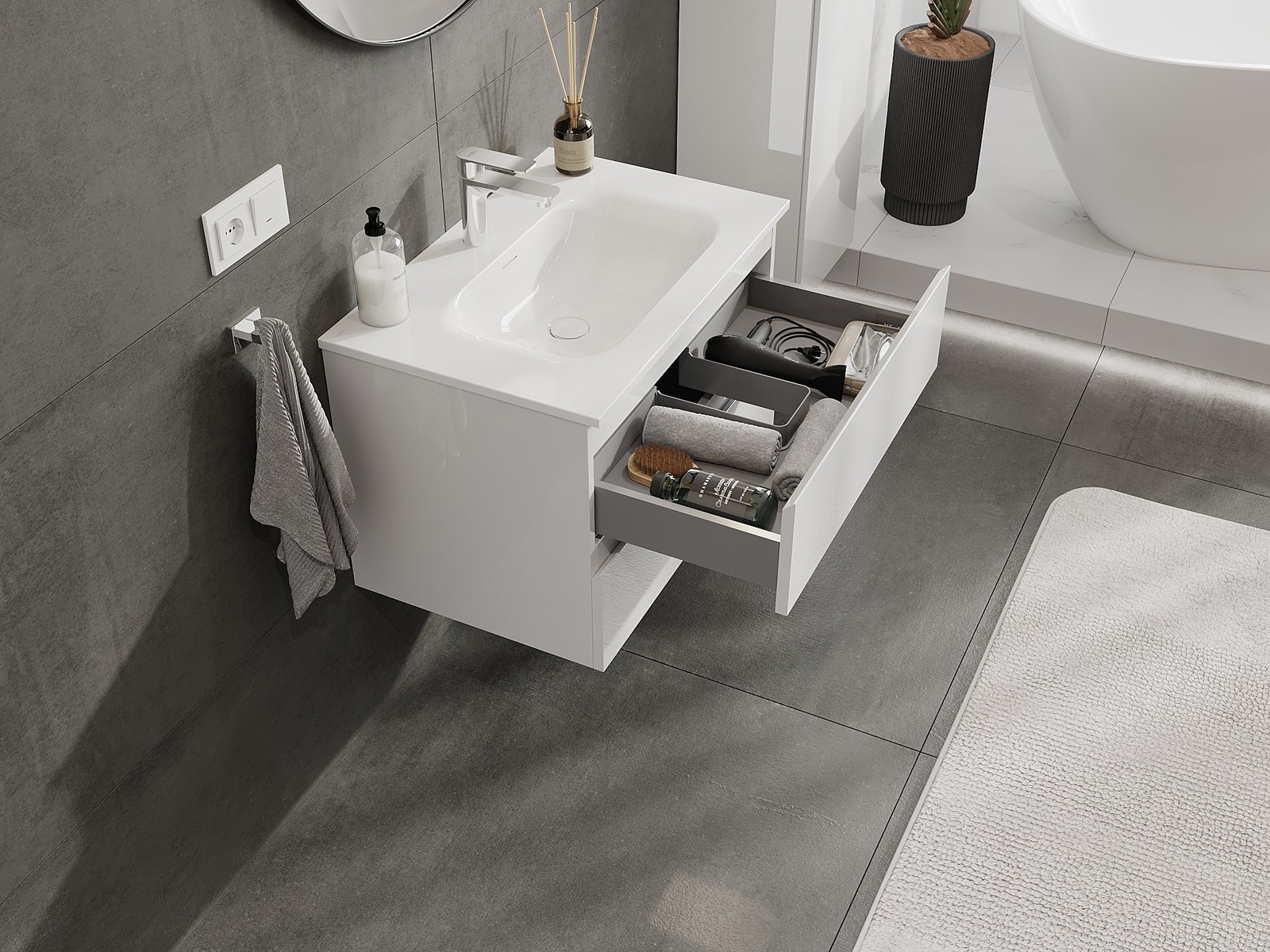 Η εγκοπή στο συρτάρι είναι σχεδιασμένη με τέτοιο τρόπο, ώστε να φιλοξενεί το σιφόνι, το οποίο είναι απαραίτητο στις εγκαταστάσεις νιπτήρων. Έτσι, το έπιπλο μπορεί να εγκατασταθεί πλήρως λειτουργικά, χωρίς την ανάγκη παραίτησης από χώρο στο συρτάρι υπέρ της εγκατάστασης.