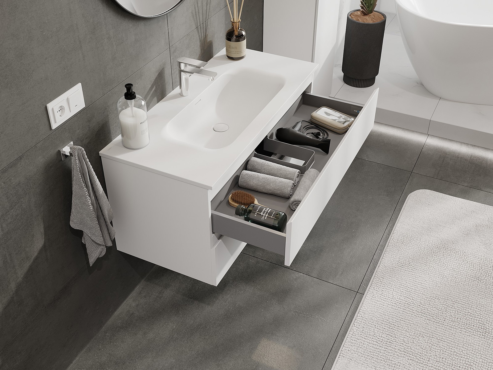 Η εγκοπή στο συρτάρι είναι σχεδιασμένη με τέτοιο τρόπο, ώστε να φιλοξενεί το σιφόνι, το οποίο είναι απαραίτητο στις εγκαταστάσεις νιπτήρων. Έτσι, το έπιπλο μπορεί να εγκατασταθεί πλήρως λειτουργικά, χωρίς την ανάγκη παραίτησης από χώρο στο συρτάρι υπέρ της εγκατάστασης.