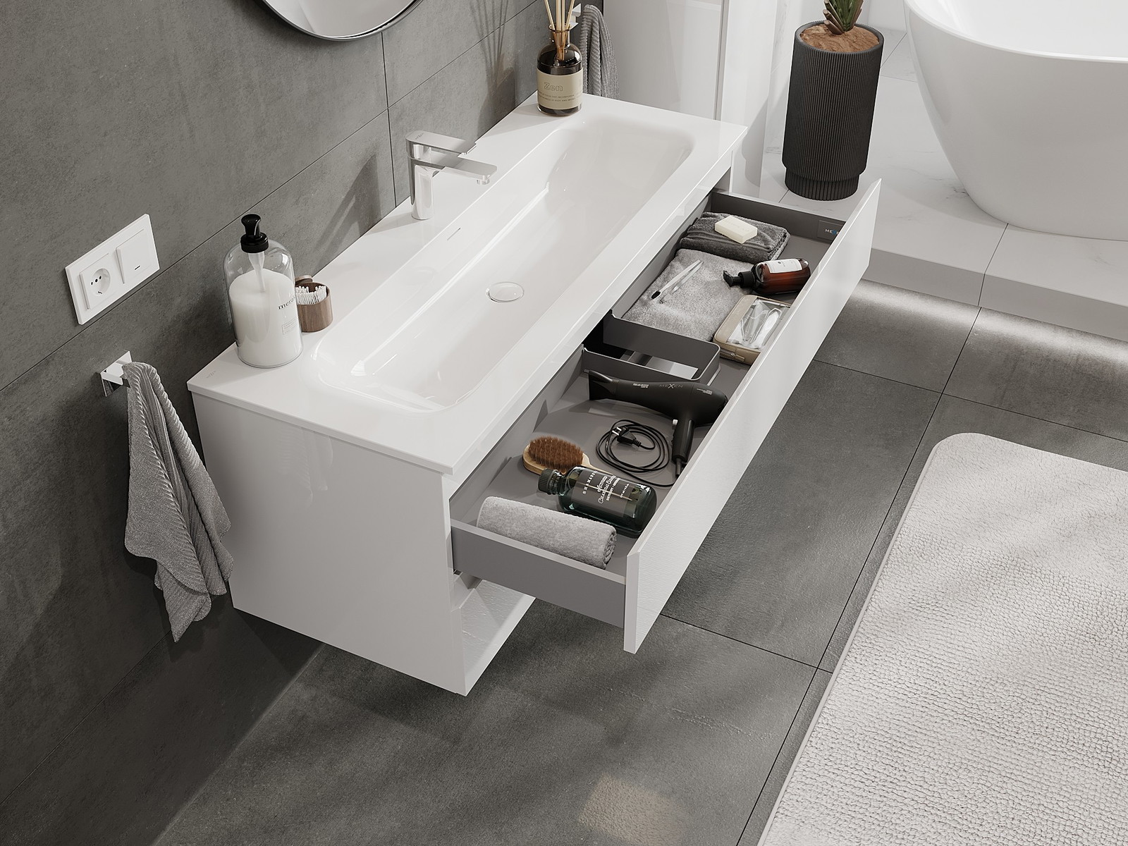 Η εγκοπή στο συρτάρι είναι σχεδιασμένη με τέτοιο τρόπο, ώστε να φιλοξενεί το σιφόνι, το οποίο είναι απαραίτητο στις εγκαταστάσεις νιπτήρων. Έτσι, το έπιπλο μπορεί να εγκατασταθεί πλήρως λειτουργικά, χωρίς την ανάγκη παραίτησης από χώρο στο συρτάρι υπέρ της εγκατάστασης.
