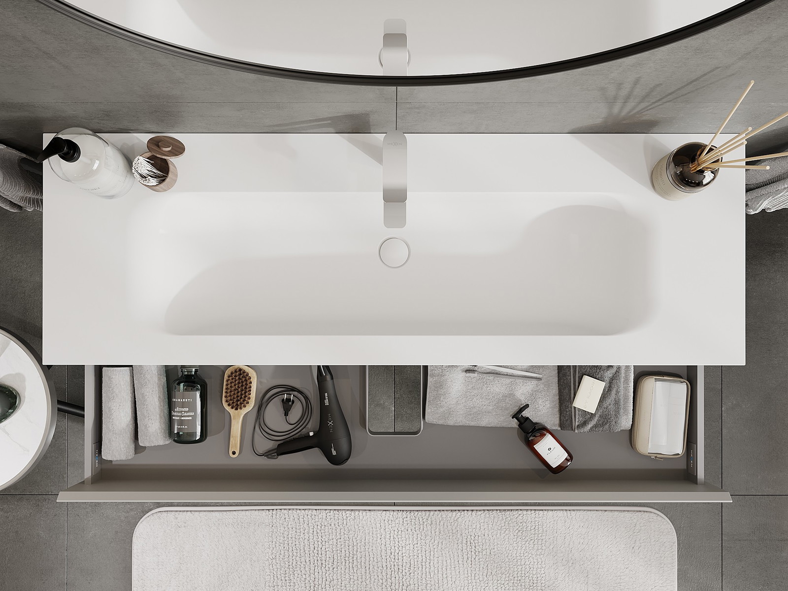 Η εγκοπή στο συρτάρι είναι σχεδιασμένη με τέτοιο τρόπο, ώστε να φιλοξενεί το σιφόνι, το οποίο είναι απαραίτητο στις εγκαταστάσεις νιπτήρων. Έτσι, το έπιπλο μπορεί να εγκατασταθεί πλήρως λειτουργικά, χωρίς την ανάγκη παραίτησης από χώρο στο συρτάρι υπέρ της εγκατάστασης.