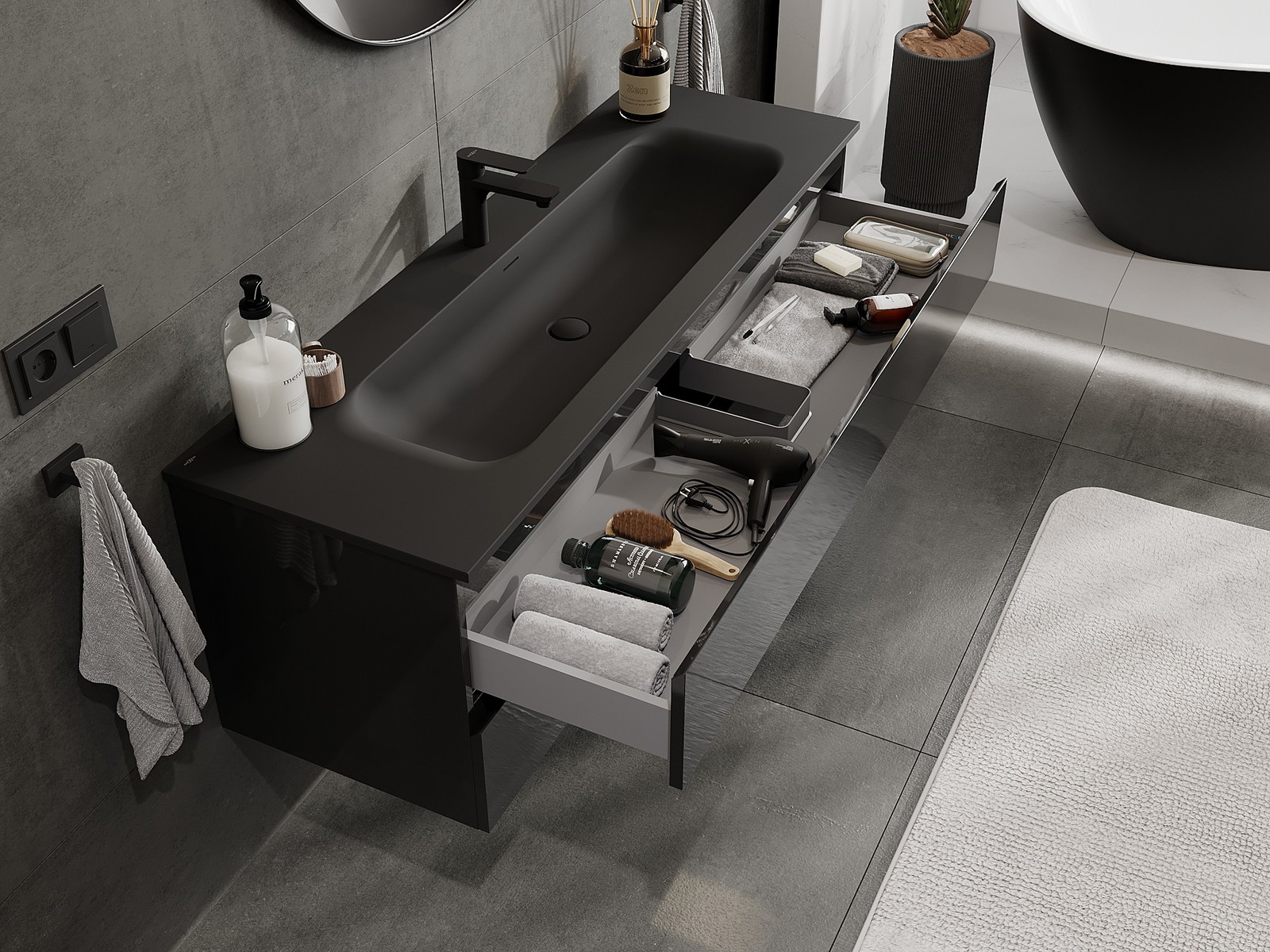 Η εγκοπή στο συρτάρι είναι σχεδιασμένη με τέτοιο τρόπο, ώστε να φιλοξενεί το σιφόνι, το οποίο είναι απαραίτητο στις εγκαταστάσεις νιπτήρων. Έτσι, το έπιπλο μπορεί να εγκατασταθεί πλήρως λειτουργικά, χωρίς την ανάγκη παραίτησης από χώρο στο συρτάρι υπέρ της εγκατάστασης.