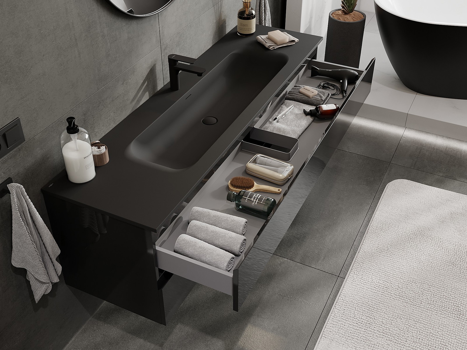 Η εγκοπή στο συρτάρι είναι σχεδιασμένη με τέτοιο τρόπο, ώστε να φιλοξενεί το σιφόνι, το οποίο είναι απαραίτητο στις εγκαταστάσεις νιπτήρων. Έτσι, το έπιπλο μπορεί να εγκατασταθεί πλήρως λειτουργικά, χωρίς την ανάγκη παραίτησης από χώρο στο συρτάρι υπέρ της εγκατάστασης.