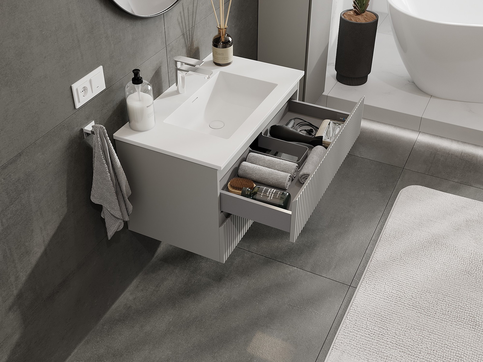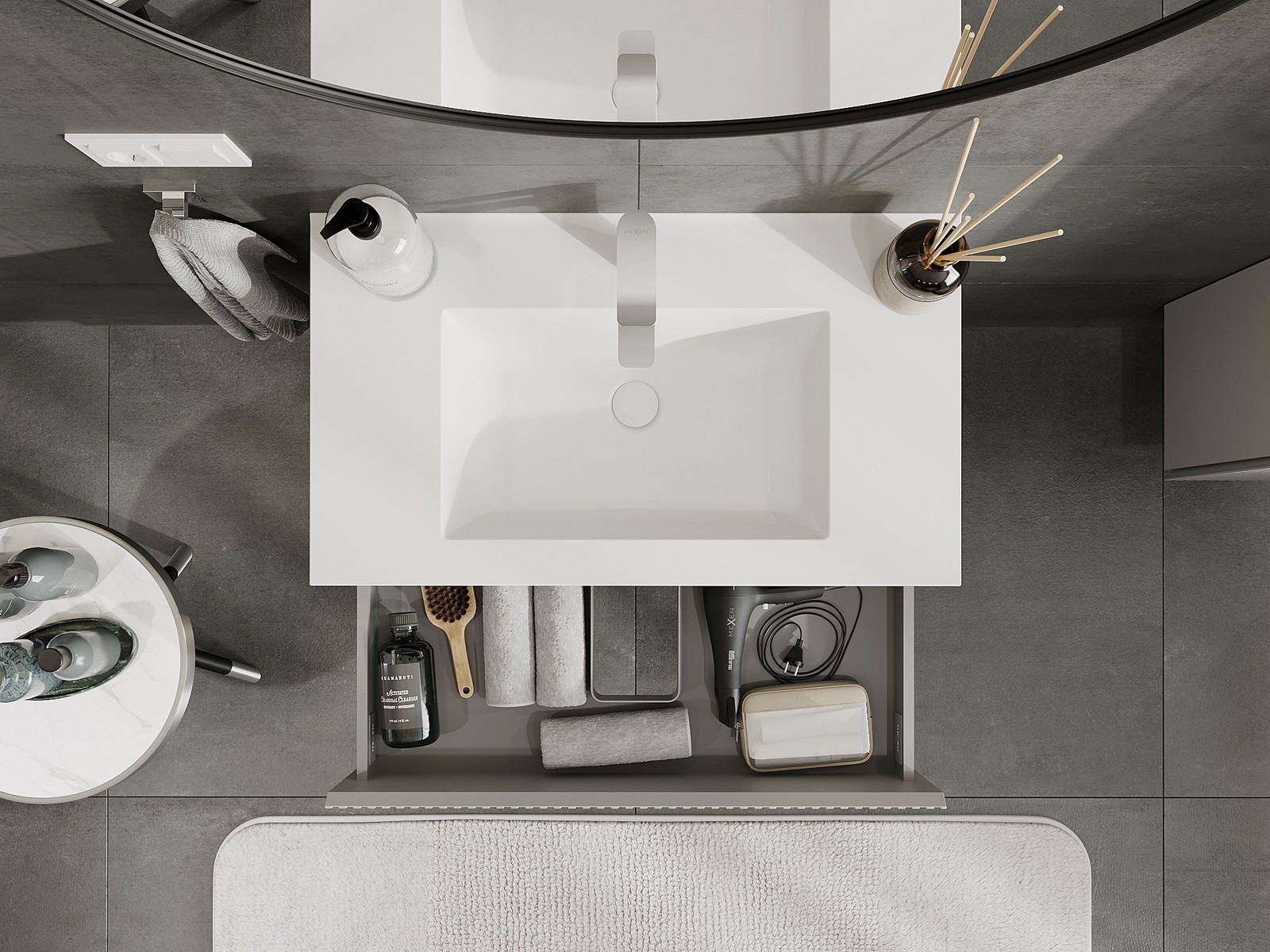 Η εγκοπή στο συρτάρι είναι σχεδιασμένη με τέτοιο τρόπο, ώστε να φιλοξενεί το σιφόνι, το οποίο είναι απαραίτητο στις εγκαταστάσεις νιπτήρων. Έτσι, το έπιπλο μπορεί να εγκατασταθεί πλήρως λειτουργικά, χωρίς την ανάγκη παραίτησης από χώρο στο συρτάρι υπέρ της εγκατάστασης.