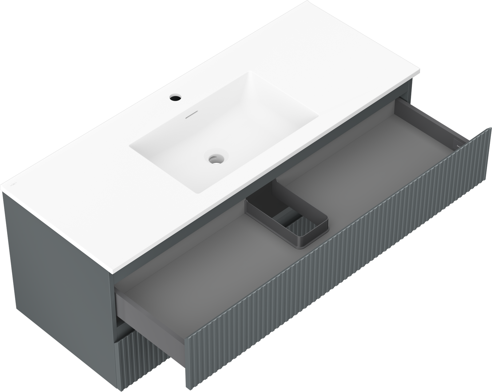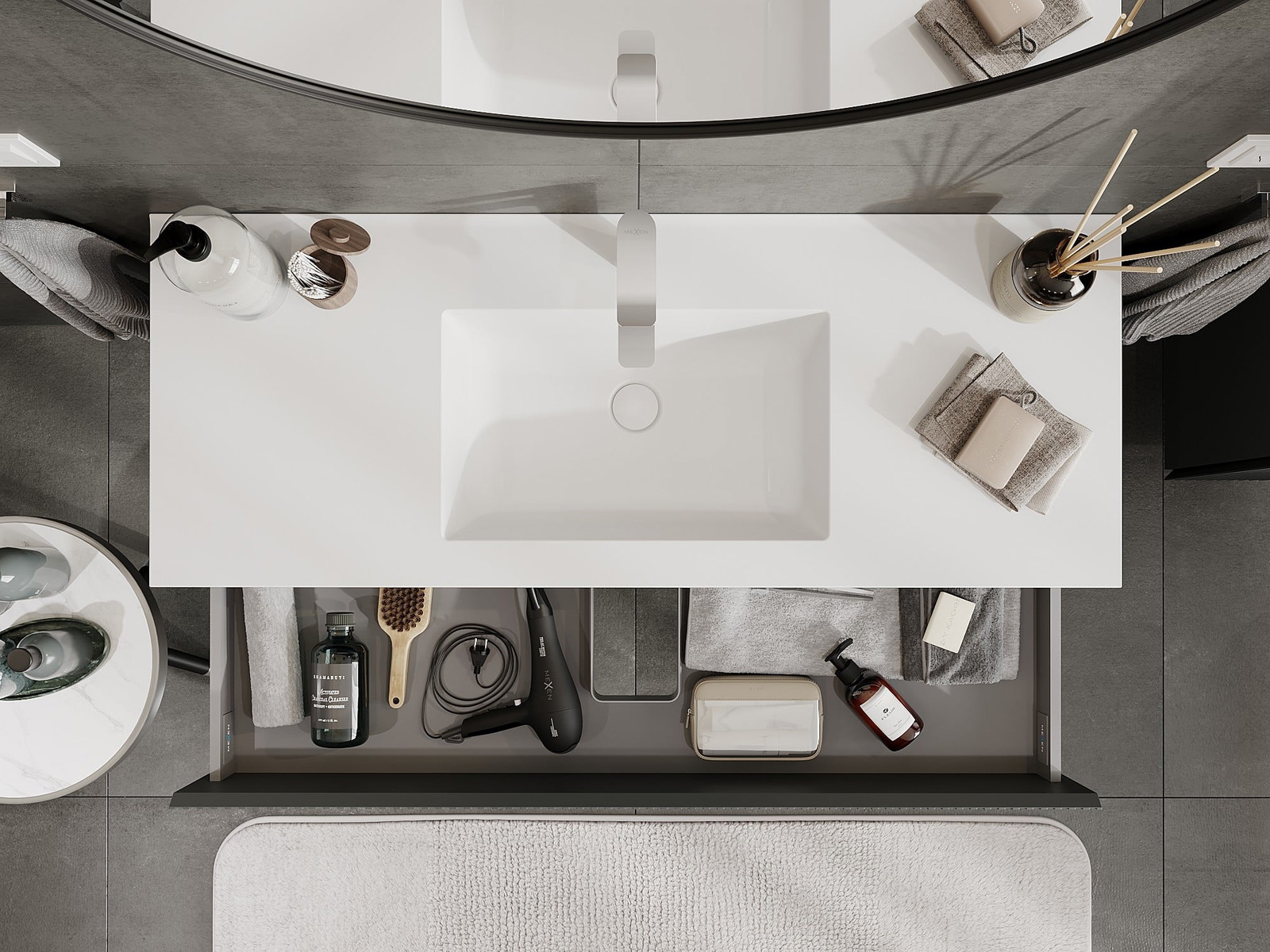 Η εγκοπή στο συρτάρι είναι σχεδιασμένη με τέτοιο τρόπο, ώστε να φιλοξενεί το σιφόνι, το οποίο είναι απαραίτητο στις εγκαταστάσεις νιπτήρων. Έτσι, το έπιπλο μπορεί να εγκατασταθεί πλήρως λειτουργικά, χωρίς την ανάγκη παραίτησης από χώρο στο συρτάρι υπέρ της εγκατάστασης.