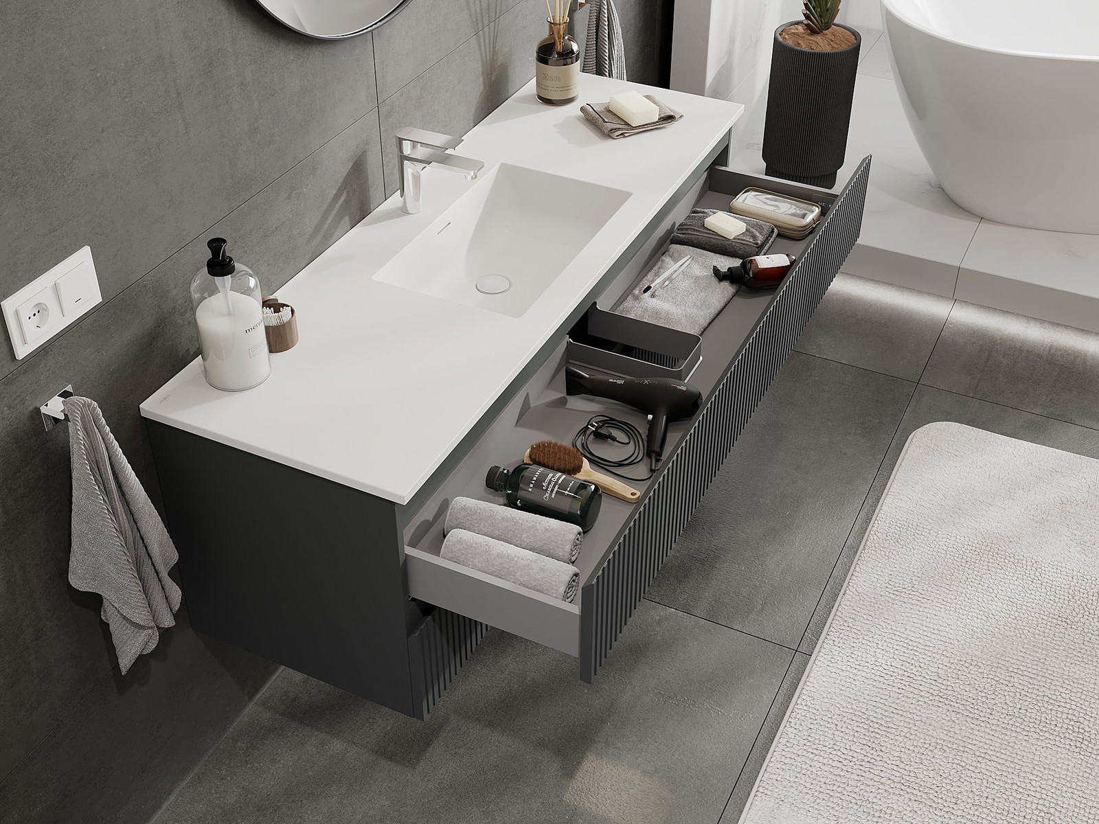 Η εγκοπή στο συρτάρι είναι σχεδιασμένη με τέτοιο τρόπο, ώστε να φιλοξενεί το σιφόνι, το οποίο είναι απαραίτητο στις εγκαταστάσεις νιπτήρων. Έτσι, το έπιπλο μπορεί να εγκατασταθεί πλήρως λειτουργικά, χωρίς την ανάγκη παραίτησης από χώρο στο συρτάρι υπέρ της εγκατάστασης.