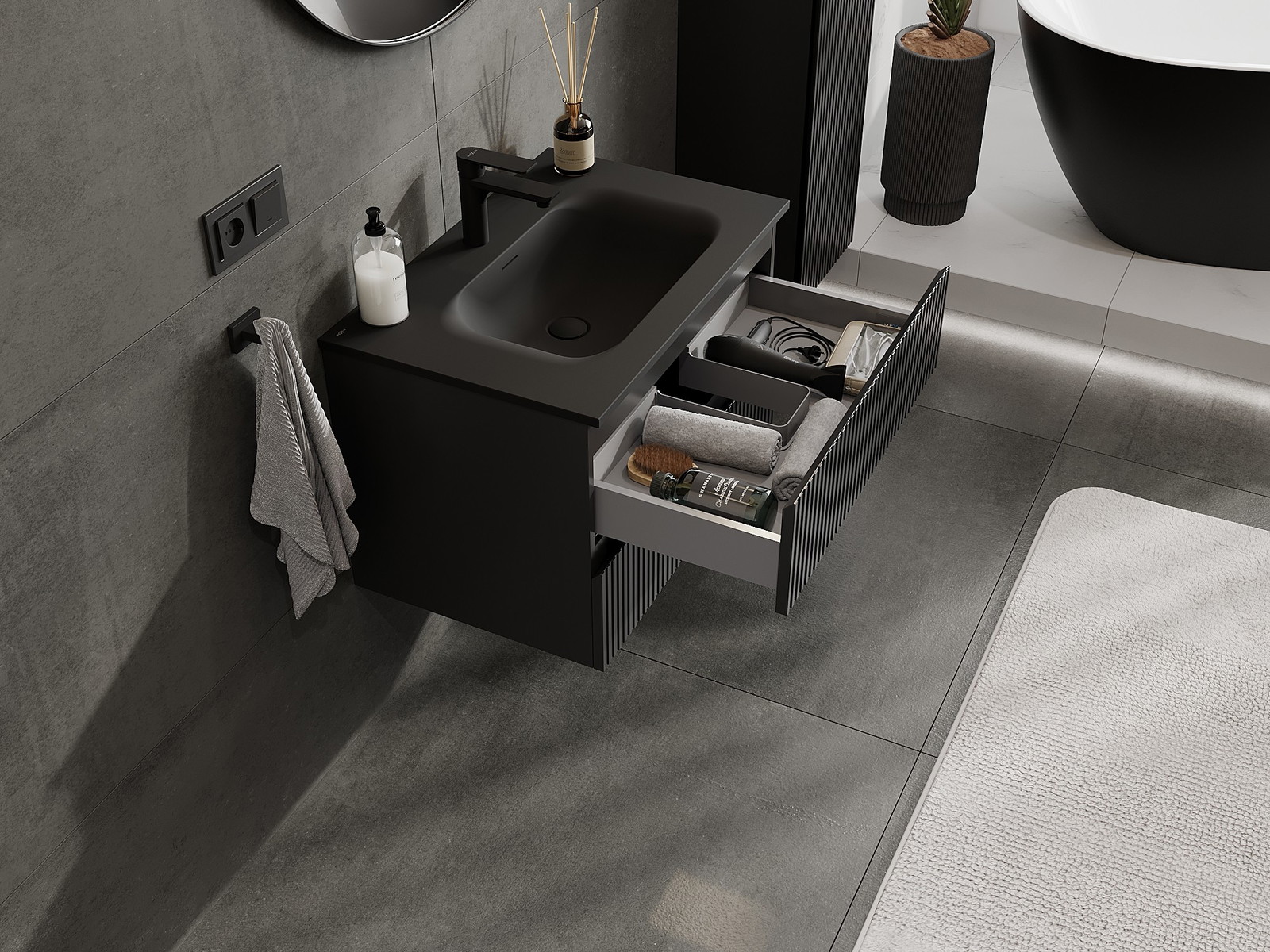 Η εγκοπή στο συρτάρι είναι σχεδιασμένη με τέτοιο τρόπο, ώστε να φιλοξενεί το σιφόνι, το οποίο είναι απαραίτητο στις εγκαταστάσεις νιπτήρων. Έτσι, το έπιπλο μπορεί να εγκατασταθεί πλήρως λειτουργικά, χωρίς την ανάγκη παραίτησης από χώρο στο συρτάρι υπέρ της εγκατάστασης.