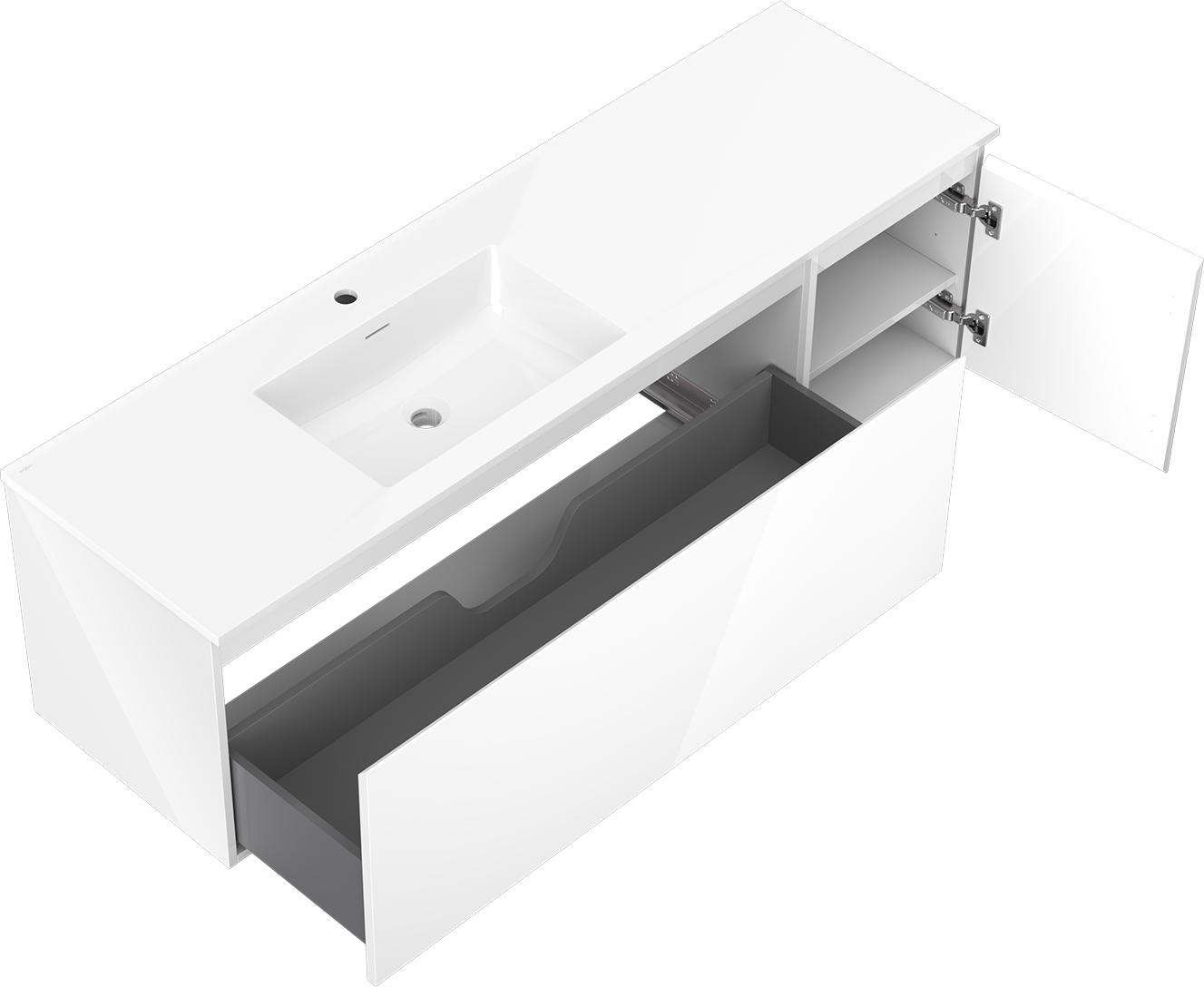 Η εγκοπή στο συρτάρι είναι σχεδιασμένη με τέτοιο τρόπο, ώστε να φιλοξενεί το σιφόνι, το οποίο είναι απαραίτητο στις εγκαταστάσεις νιπτήρων. Έτσι, το έπιπλο μπορεί να εγκατασταθεί πλήρως λειτουργικά, χωρίς την ανάγκη παραίτησης από χώρο στο συρτάρι υπέρ της εγκατάστασης.