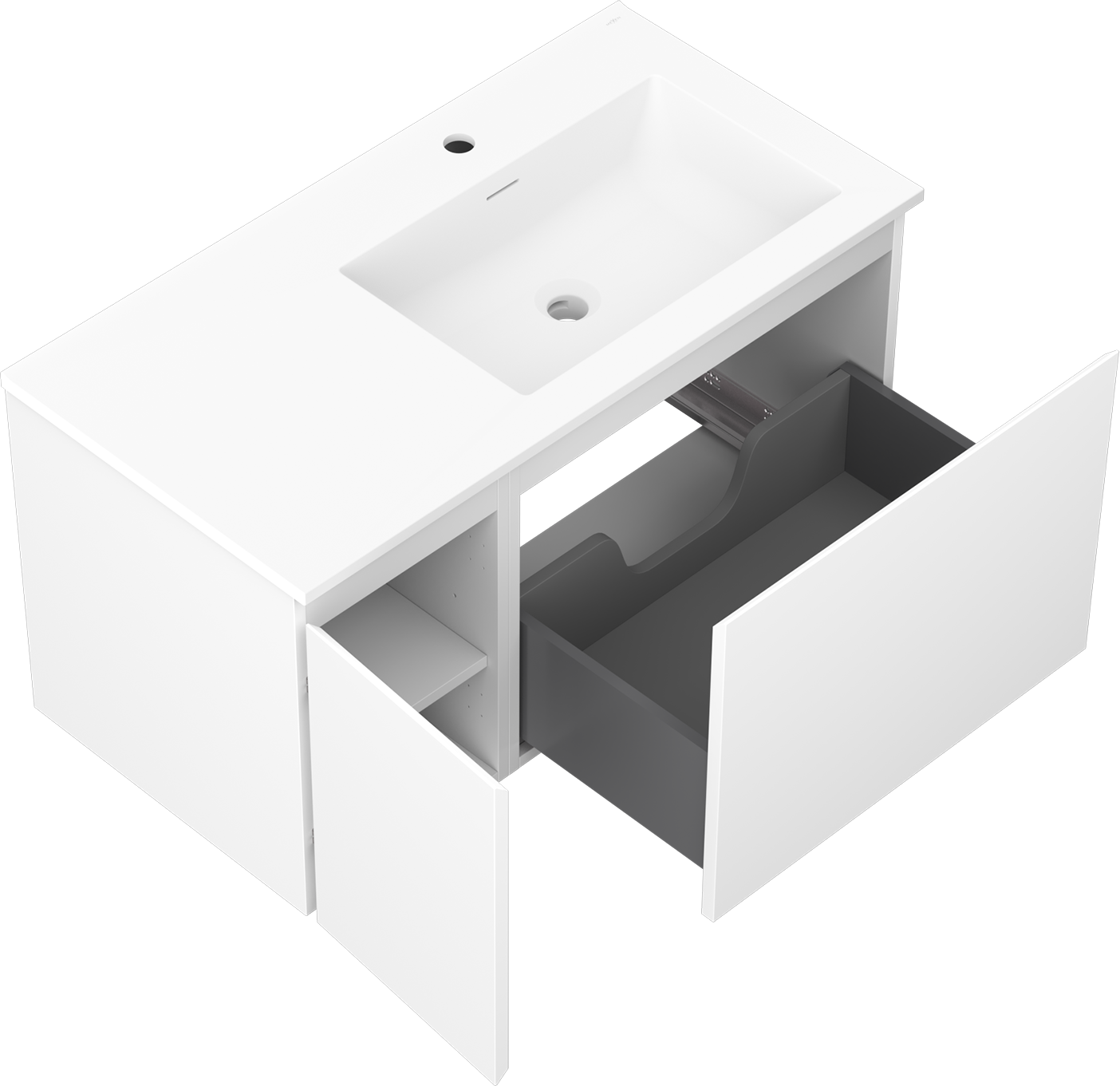 Η εγκοπή στο συρτάρι είναι σχεδιασμένη με τέτοιο τρόπο, ώστε να φιλοξενεί το σιφόνι, το οποίο είναι απαραίτητο στις εγκαταστάσεις νιπτήρων. Έτσι, το έπιπλο μπορεί να εγκατασταθεί πλήρως λειτουργικά, χωρίς την ανάγκη παραίτησης από χώρο στο συρτάρι υπέρ της εγκατάστασης.