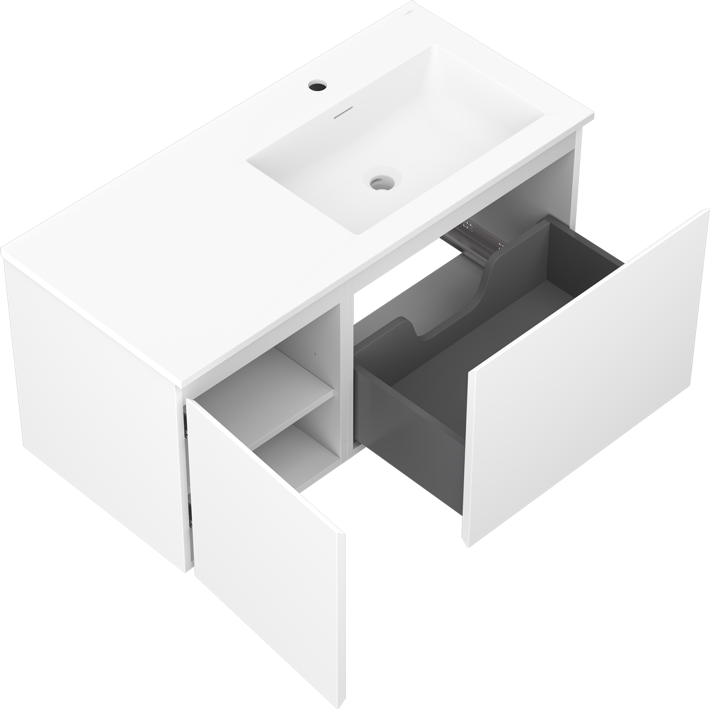 Η εγκοπή στο συρτάρι είναι σχεδιασμένη με τέτοιο τρόπο, ώστε να φιλοξενεί το σιφόνι, το οποίο είναι απαραίτητο στις εγκαταστάσεις νιπτήρων. Έτσι, το έπιπλο μπορεί να εγκατασταθεί πλήρως λειτουργικά, χωρίς την ανάγκη παραίτησης από χώρο στο συρτάρι υπέρ της εγκατάστασης.