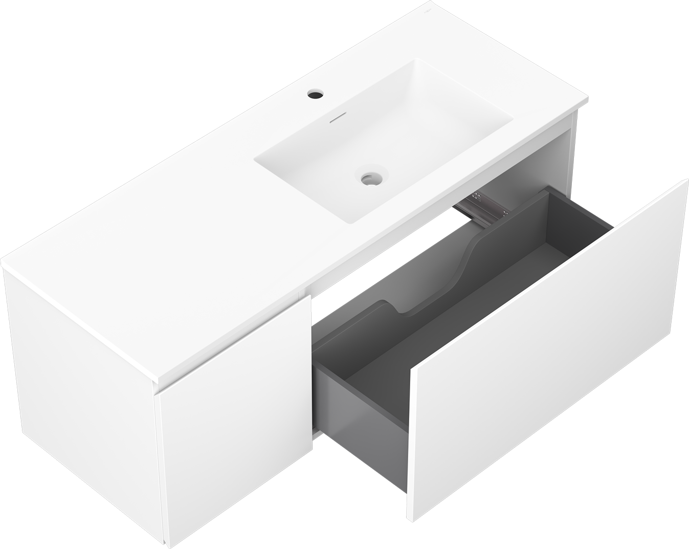 Η εγκοπή στο συρτάρι είναι σχεδιασμένη με τέτοιο τρόπο, ώστε να φιλοξενεί το σιφόνι, το οποίο είναι απαραίτητο στις εγκαταστάσεις νιπτήρων. Έτσι, το έπιπλο μπορεί να εγκατασταθεί πλήρως λειτουργικά, χωρίς την ανάγκη παραίτησης από χώρο στο συρτάρι υπέρ της εγκατάστασης.