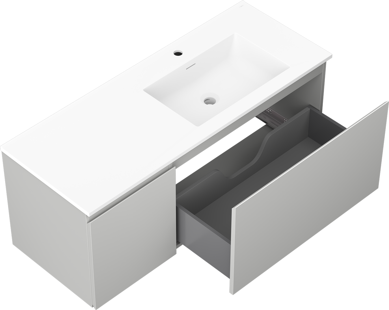 Η εγκοπή στο συρτάρι είναι σχεδιασμένη με τέτοιο τρόπο, ώστε να φιλοξενεί το σιφόνι, το οποίο είναι απαραίτητο στις εγκαταστάσεις νιπτήρων. Έτσι, το έπιπλο μπορεί να εγκατασταθεί πλήρως λειτουργικά, χωρίς την ανάγκη παραίτησης από χώρο στο συρτάρι υπέρ της εγκατάστασης.