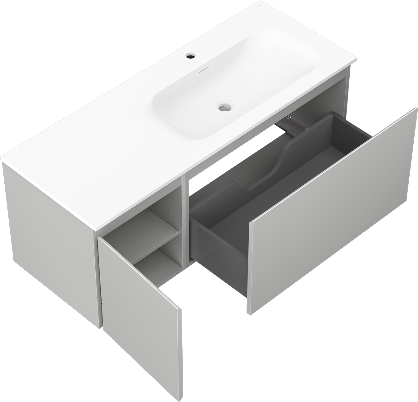 Η εγκοπή στο συρτάρι είναι σχεδιασμένη με τέτοιο τρόπο, ώστε να φιλοξενεί το σιφόνι, το οποίο είναι απαραίτητο στις εγκαταστάσεις νιπτήρων. Έτσι, το έπιπλο μπορεί να εγκατασταθεί πλήρως λειτουργικά, χωρίς την ανάγκη παραίτησης από χώρο στο συρτάρι υπέρ της εγκατάστασης.