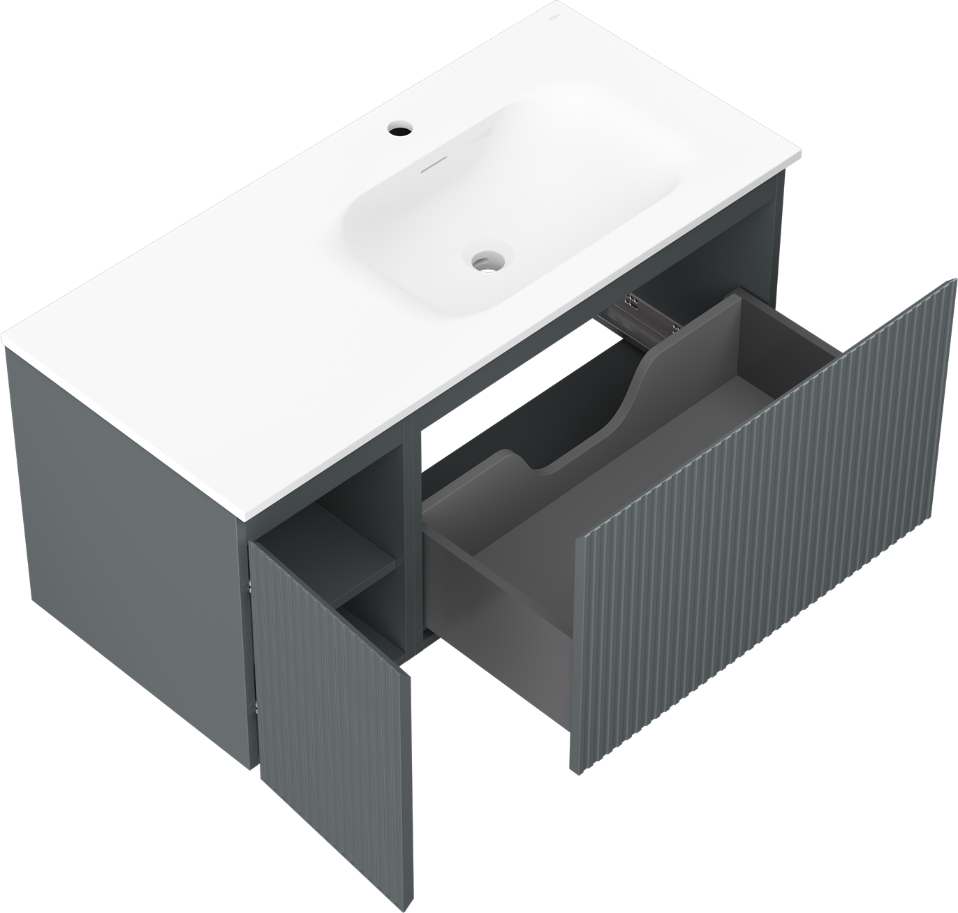 Η εγκοπή στο συρτάρι είναι σχεδιασμένη με τέτοιο τρόπο, ώστε να φιλοξενεί το σιφόνι, το οποίο είναι απαραίτητο στις εγκαταστάσεις νιπτήρων. Έτσι, το έπιπλο μπορεί να εγκατασταθεί πλήρως λειτουργικά, χωρίς την ανάγκη παραίτησης από χώρο στο συρτάρι υπέρ της εγκατάστασης.