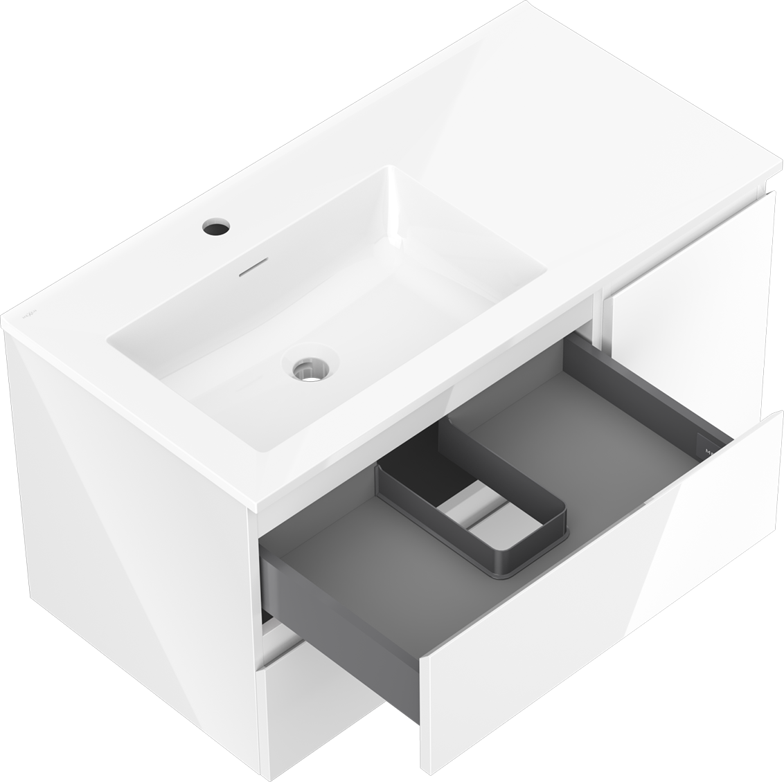 Η εγκοπή στο συρτάρι είναι σχεδιασμένη με τέτοιο τρόπο, ώστε να φιλοξενεί το σιφόνι, το οποίο είναι απαραίτητο στις εγκαταστάσεις νιπτήρων. Έτσι, το έπιπλο μπορεί να εγκατασταθεί πλήρως λειτουργικά, χωρίς την ανάγκη παραίτησης από χώρο στο συρτάρι υπέρ της εγκατάστασης.