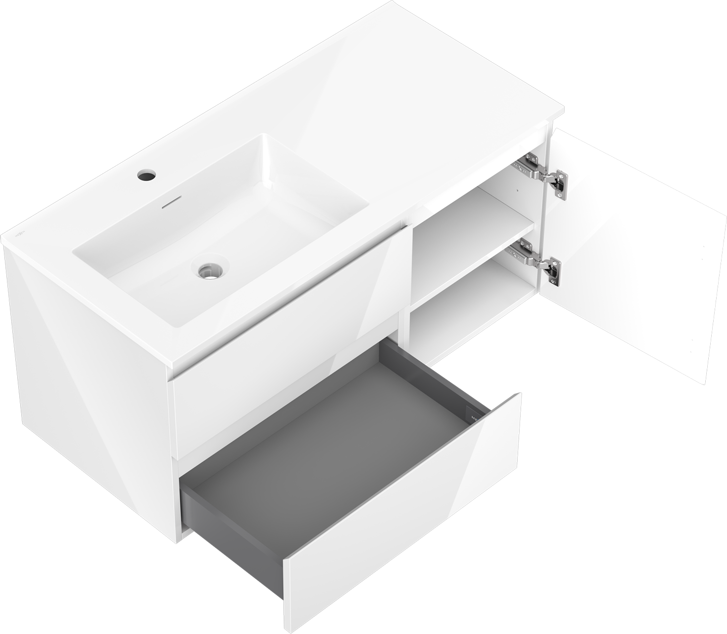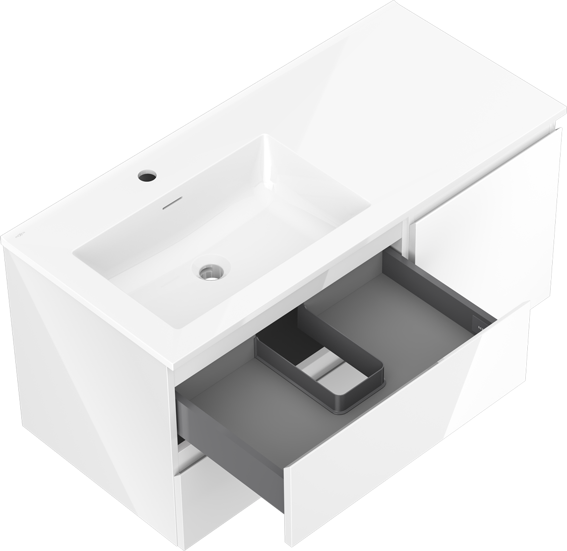 Η εγκοπή στο συρτάρι είναι σχεδιασμένη με τέτοιο τρόπο, ώστε να φιλοξενεί το σιφόνι, το οποίο είναι απαραίτητο στις εγκαταστάσεις νιπτήρων. Έτσι, το έπιπλο μπορεί να εγκατασταθεί πλήρως λειτουργικά, χωρίς την ανάγκη παραίτησης από χώρο στο συρτάρι υπέρ της εγκατάστασης.