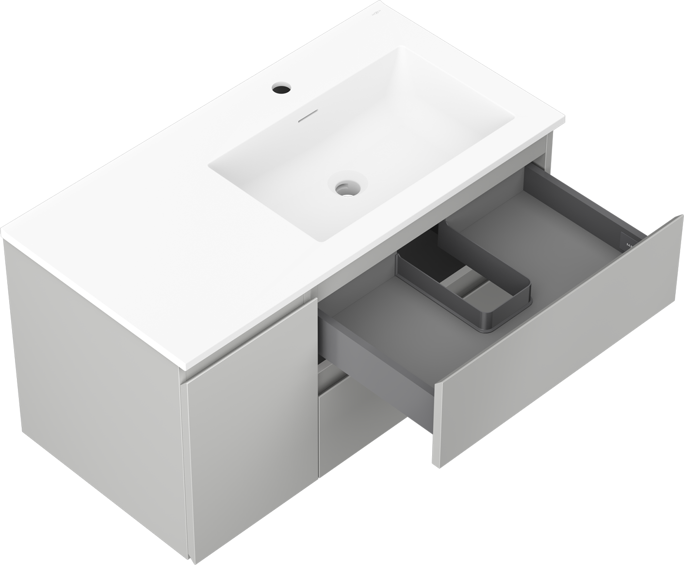 Η εγκοπή στο συρτάρι είναι σχεδιασμένη με τέτοιο τρόπο, ώστε να φιλοξενεί το σιφόνι, το οποίο είναι απαραίτητο στις εγκαταστάσεις νιπτήρων. Έτσι, το έπιπλο μπορεί να εγκατασταθεί πλήρως λειτουργικά, χωρίς την ανάγκη παραίτησης από χώρο στο συρτάρι υπέρ της εγκατάστασης.