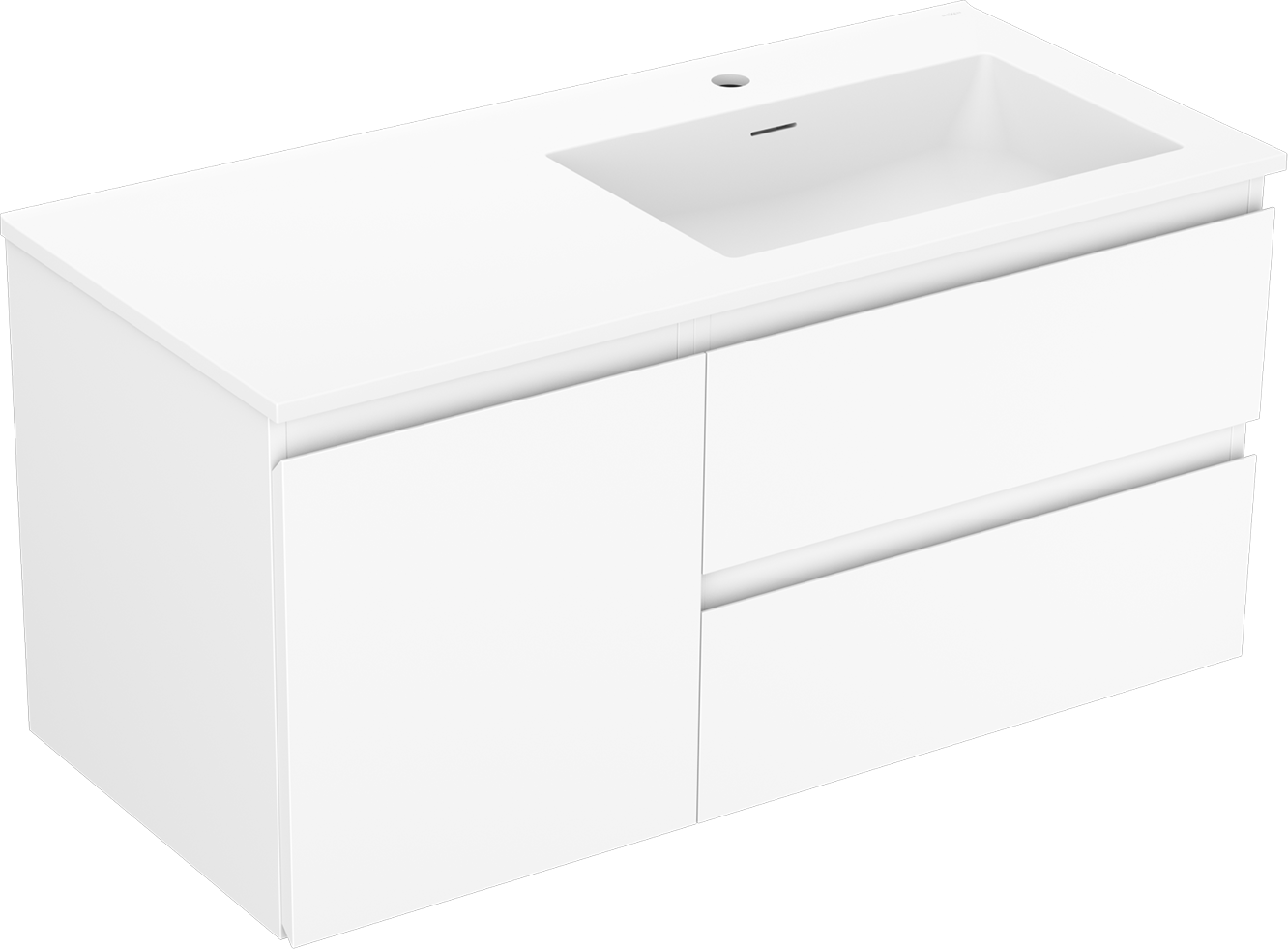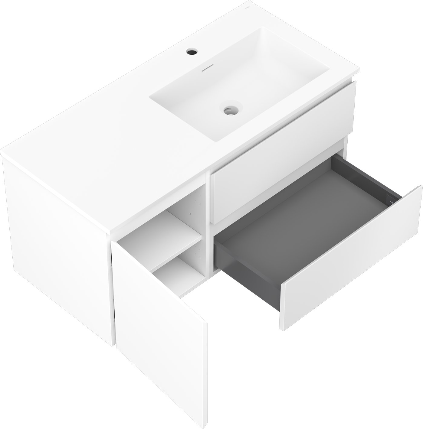 Η εγκοπή στο συρτάρι είναι σχεδιασμένη με τέτοιο τρόπο, ώστε να φιλοξενεί το σιφόνι, το οποίο είναι απαραίτητο στις εγκαταστάσεις νιπτήρων. Έτσι, το έπιπλο μπορεί να εγκατασταθεί πλήρως λειτουργικά, χωρίς την ανάγκη παραίτησης από χώρο στο συρτάρι υπέρ της εγκατάστασης.