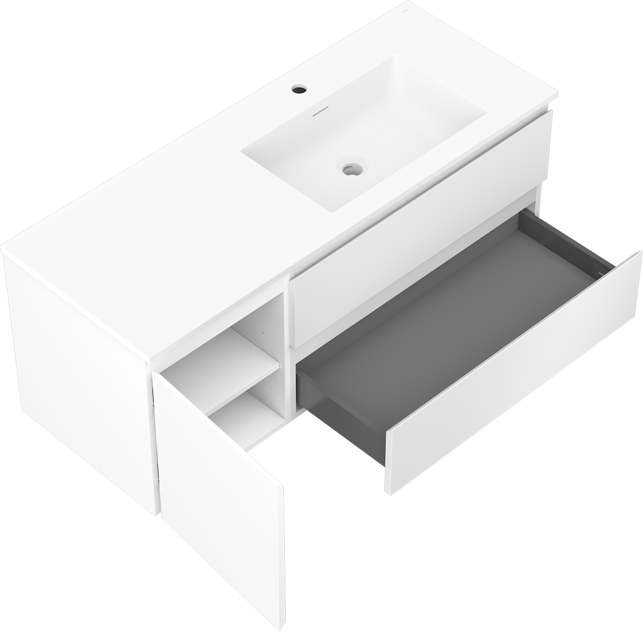Η εγκοπή στο συρτάρι είναι σχεδιασμένη με τέτοιο τρόπο, ώστε να φιλοξενεί το σιφόνι, το οποίο είναι απαραίτητο στις εγκαταστάσεις νιπτήρων. Έτσι, το έπιπλο μπορεί να εγκατασταθεί πλήρως λειτουργικά, χωρίς την ανάγκη παραίτησης από χώρο στο συρτάρι υπέρ της εγκατάστασης.