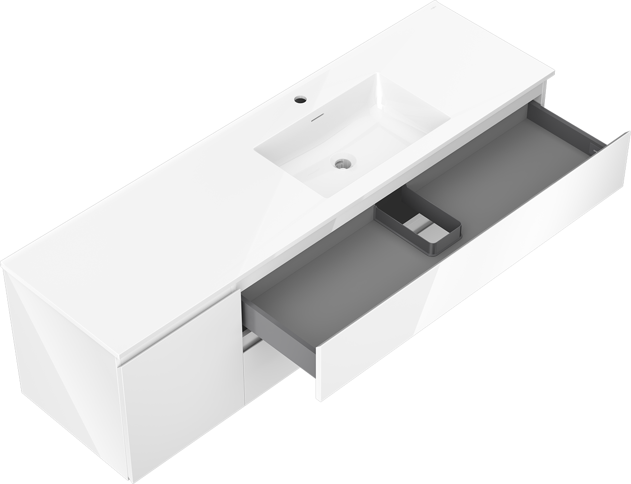 Η εγκοπή στο συρτάρι είναι σχεδιασμένη με τέτοιο τρόπο, ώστε να φιλοξενεί το σιφόνι, το οποίο είναι απαραίτητο στις εγκαταστάσεις νιπτήρων. Έτσι, το έπιπλο μπορεί να εγκατασταθεί πλήρως λειτουργικά, χωρίς την ανάγκη παραίτησης από χώρο στο συρτάρι υπέρ της εγκατάστασης.