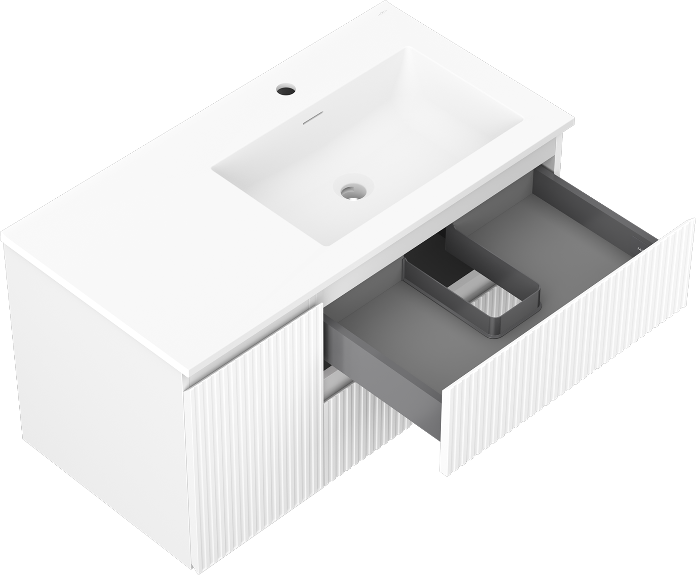 Η εγκοπή στο συρτάρι είναι σχεδιασμένη με τέτοιο τρόπο, ώστε να φιλοξενεί το σιφόνι, το οποίο είναι απαραίτητο στις εγκαταστάσεις νιπτήρων. Έτσι, το έπιπλο μπορεί να εγκατασταθεί πλήρως λειτουργικά, χωρίς την ανάγκη παραίτησης από χώρο στο συρτάρι υπέρ της εγκατάστασης.