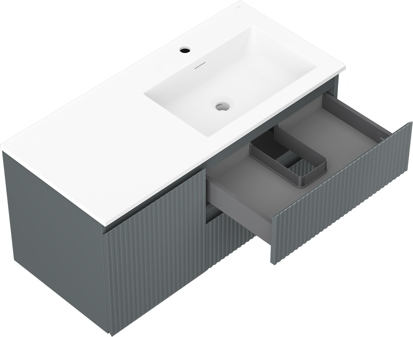 Η εγκοπή στο συρτάρι είναι σχεδιασμένη με τέτοιο τρόπο, ώστε να φιλοξενεί το σιφόνι, το οποίο είναι απαραίτητο στις εγκαταστάσεις νιπτήρων. Έτσι, το έπιπλο μπορεί να εγκατασταθεί πλήρως λειτουργικά, χωρίς την ανάγκη παραίτησης από χώρο στο συρτάρι υπέρ της εγκατάστασης.