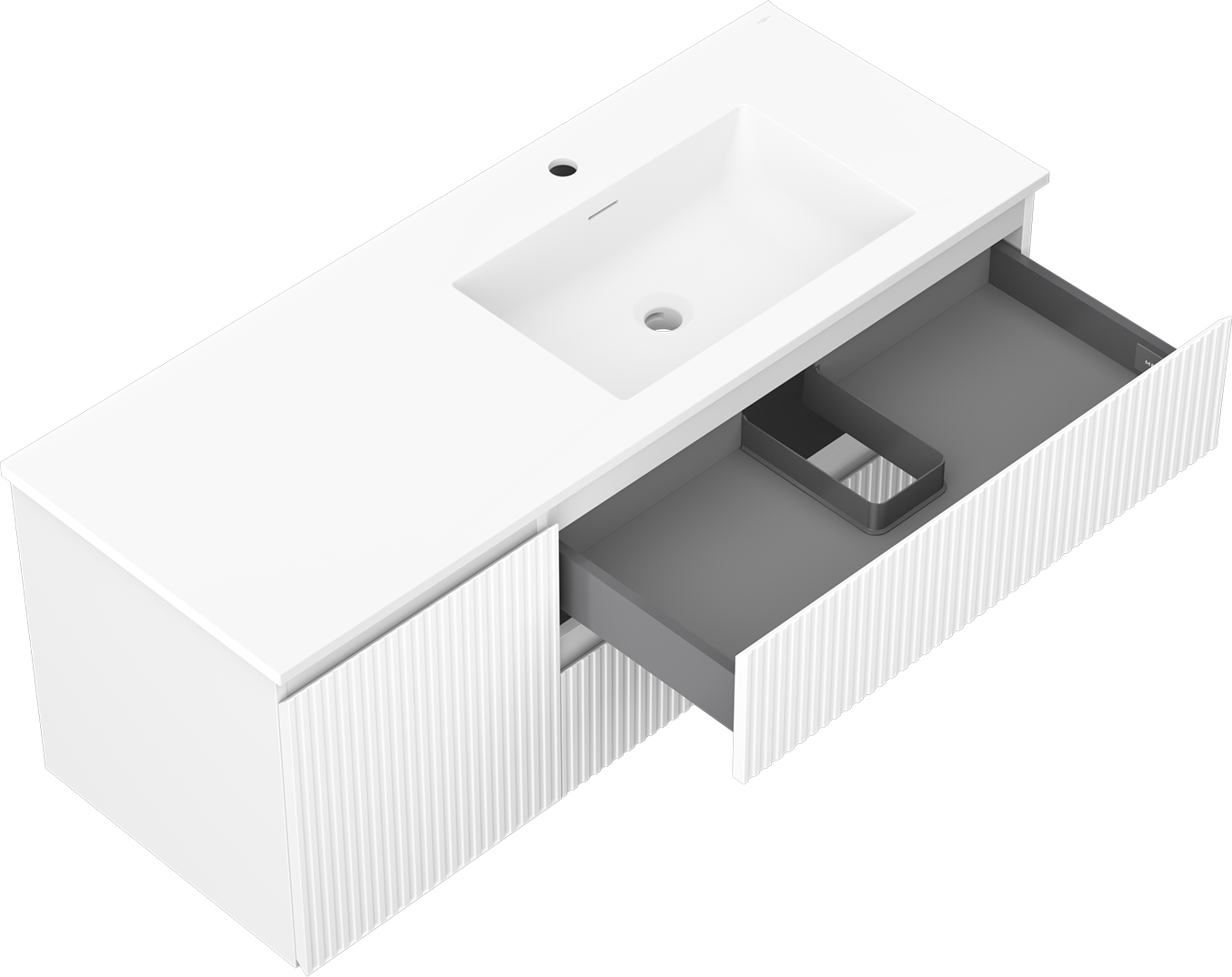 Η εγκοπή στο συρτάρι είναι σχεδιασμένη με τέτοιο τρόπο, ώστε να φιλοξενεί το σιφόνι, το οποίο είναι απαραίτητο στις εγκαταστάσεις νιπτήρων. Έτσι, το έπιπλο μπορεί να εγκατασταθεί πλήρως λειτουργικά, χωρίς την ανάγκη παραίτησης από χώρο στο συρτάρι υπέρ της εγκατάστασης.