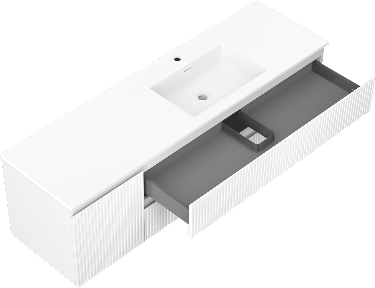 Η εγκοπή στο συρτάρι είναι σχεδιασμένη με τέτοιο τρόπο, ώστε να φιλοξενεί το σιφόνι, το οποίο είναι απαραίτητο στις εγκαταστάσεις νιπτήρων. Έτσι, το έπιπλο μπορεί να εγκατασταθεί πλήρως λειτουργικά, χωρίς την ανάγκη παραίτησης από χώρο στο συρτάρι υπέρ της εγκατάστασης.