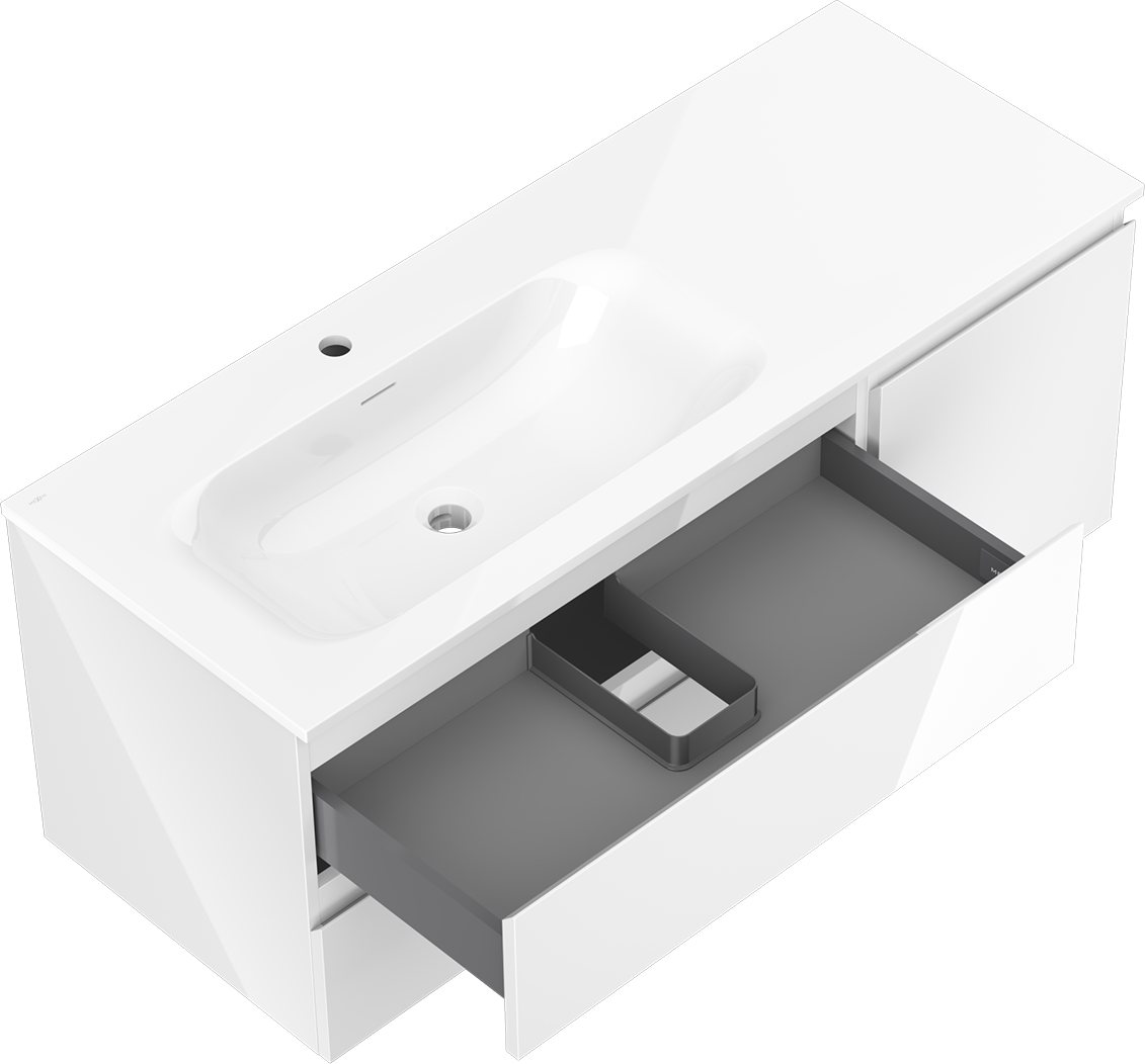 Η εγκοπή στο συρτάρι είναι σχεδιασμένη με τέτοιο τρόπο, ώστε να φιλοξενεί το σιφόνι, το οποίο είναι απαραίτητο στις εγκαταστάσεις νιπτήρων. Έτσι, το έπιπλο μπορεί να εγκατασταθεί πλήρως λειτουργικά, χωρίς την ανάγκη παραίτησης από χώρο στο συρτάρι υπέρ της εγκατάστασης.