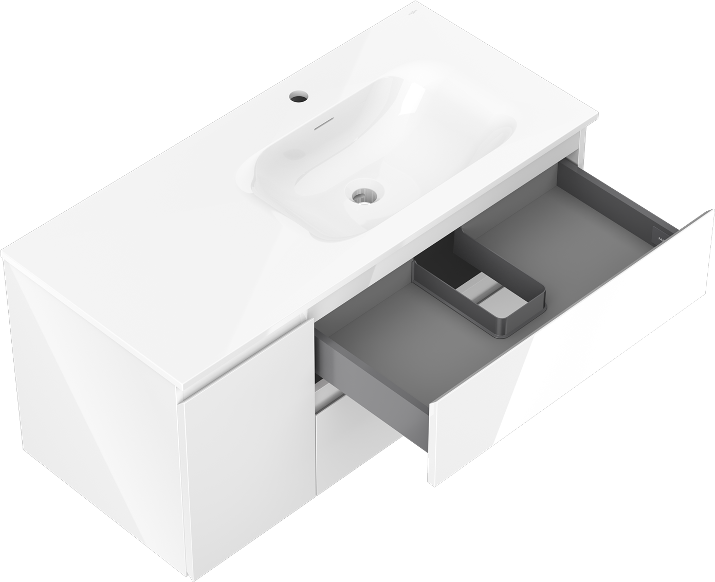 Η εγκοπή στο συρτάρι είναι σχεδιασμένη με τέτοιο τρόπο, ώστε να φιλοξενεί το σιφόνι, το οποίο είναι απαραίτητο στις εγκαταστάσεις νιπτήρων. Έτσι, το έπιπλο μπορεί να εγκατασταθεί πλήρως λειτουργικά, χωρίς την ανάγκη παραίτησης από χώρο στο συρτάρι υπέρ της εγκατάστασης.