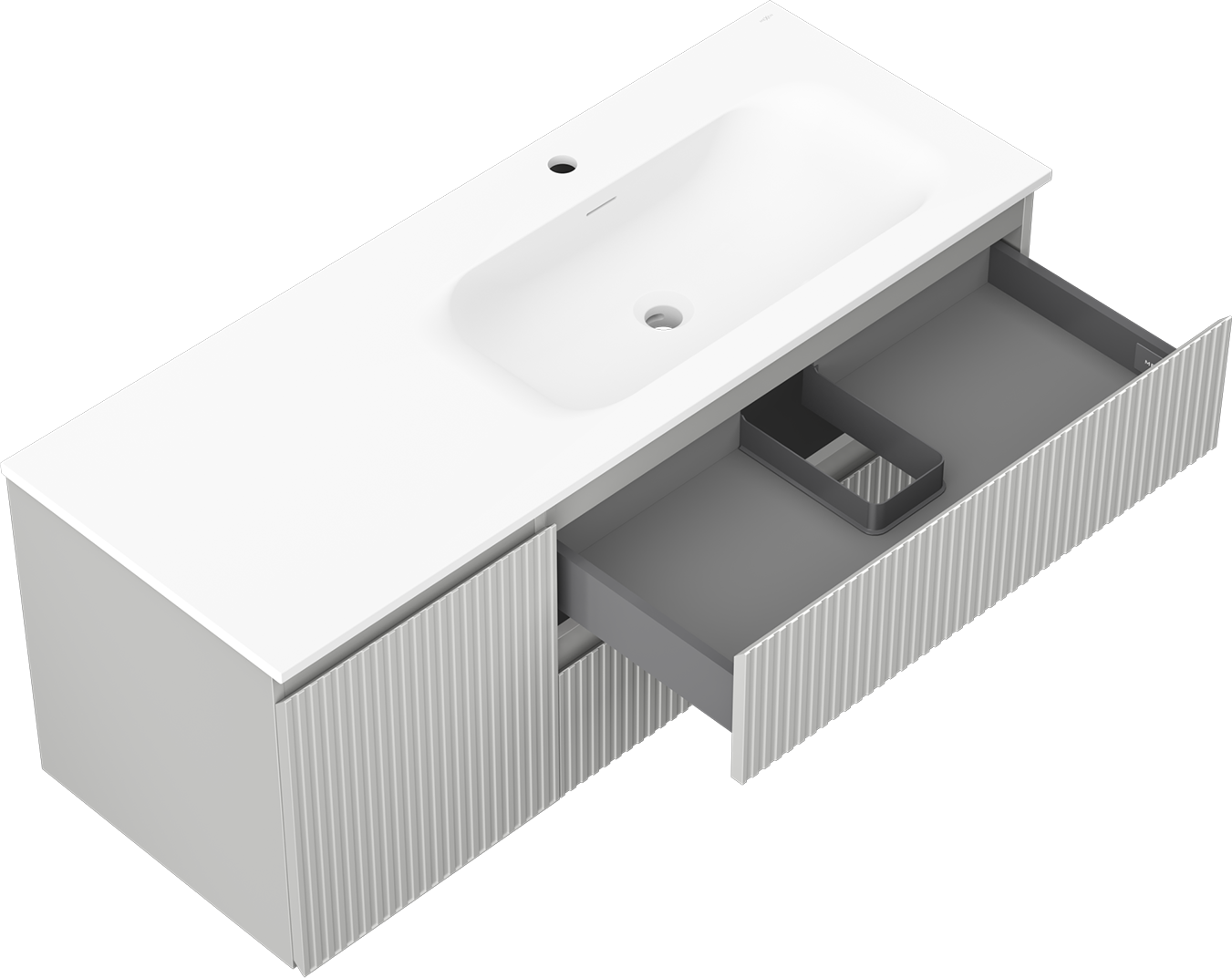 Η εγκοπή στο συρτάρι είναι σχεδιασμένη με τέτοιο τρόπο, ώστε να φιλοξενεί το σιφόνι, το οποίο είναι απαραίτητο στις εγκαταστάσεις νιπτήρων. Έτσι, το έπιπλο μπορεί να εγκατασταθεί πλήρως λειτουργικά, χωρίς την ανάγκη παραίτησης από χώρο στο συρτάρι υπέρ της εγκατάστασης.