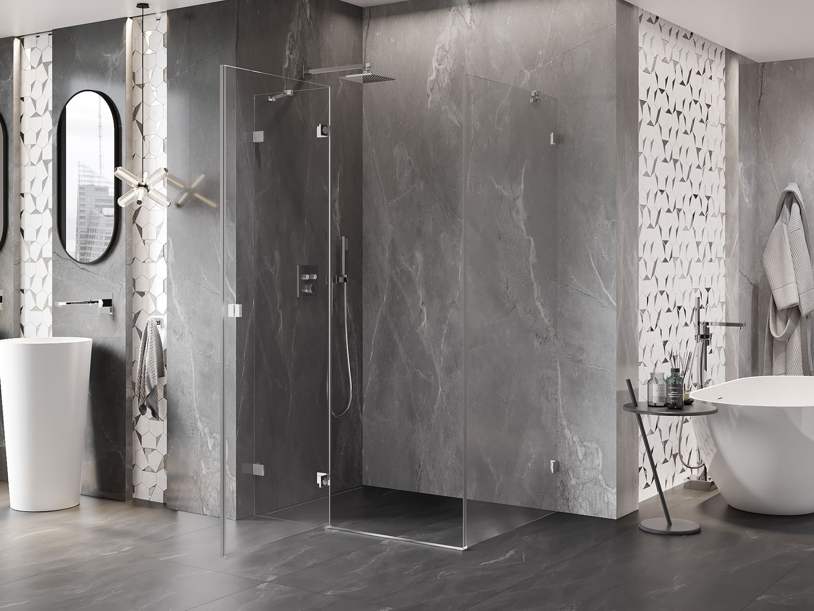Οι σφιγκτήρες και οι μεντεσέδες είναι κατασκευασμένοι από πολύ ανθεκτικό ορείχαλκο και επιπλέον δημιουργούν μια ευθυγραμμισμένη επιφάνεια γυαλιού. Είναι μια εξαιρετική επιλογή που συνδυάζει κομψότητα, ανθεκτικότητα και σύγχρονο σχεδιασμό. Χάρη σε αυτές τις λύσεις, η ντουζιέρα κερδίζει σε αισθητική και ταυτόχρονα διευκολύνουν τη διατήρηση της καθαριότητας.
