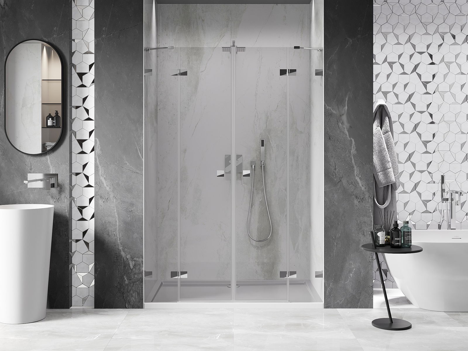 Οι σφιγκτήρες και οι μεντεσέδες είναι κατασκευασμένοι από πολύ ανθεκτικό ορείχαλκο και επιπλέον δημιουργούν μια ευθυγραμμισμένη επιφάνεια γυαλιού. Είναι μια εξαιρετική επιλογή που συνδυάζει κομψότητα, ανθεκτικότητα και σύγχρονο σχεδιασμό. Χάρη σε αυτές τις λύσεις, η ντουζιέρα κερδίζει σε αισθητική και ταυτόχρονα διευκολύνουν τη διατήρηση της καθαριότητας.