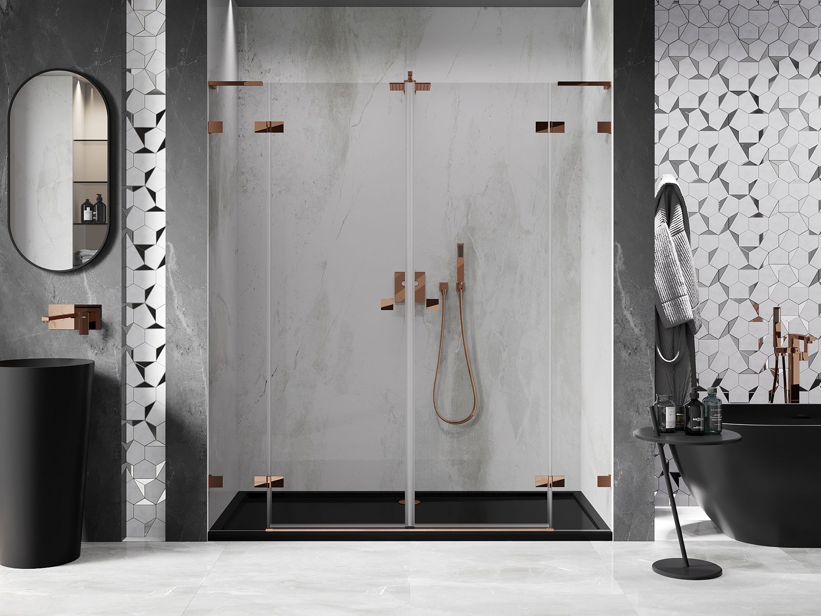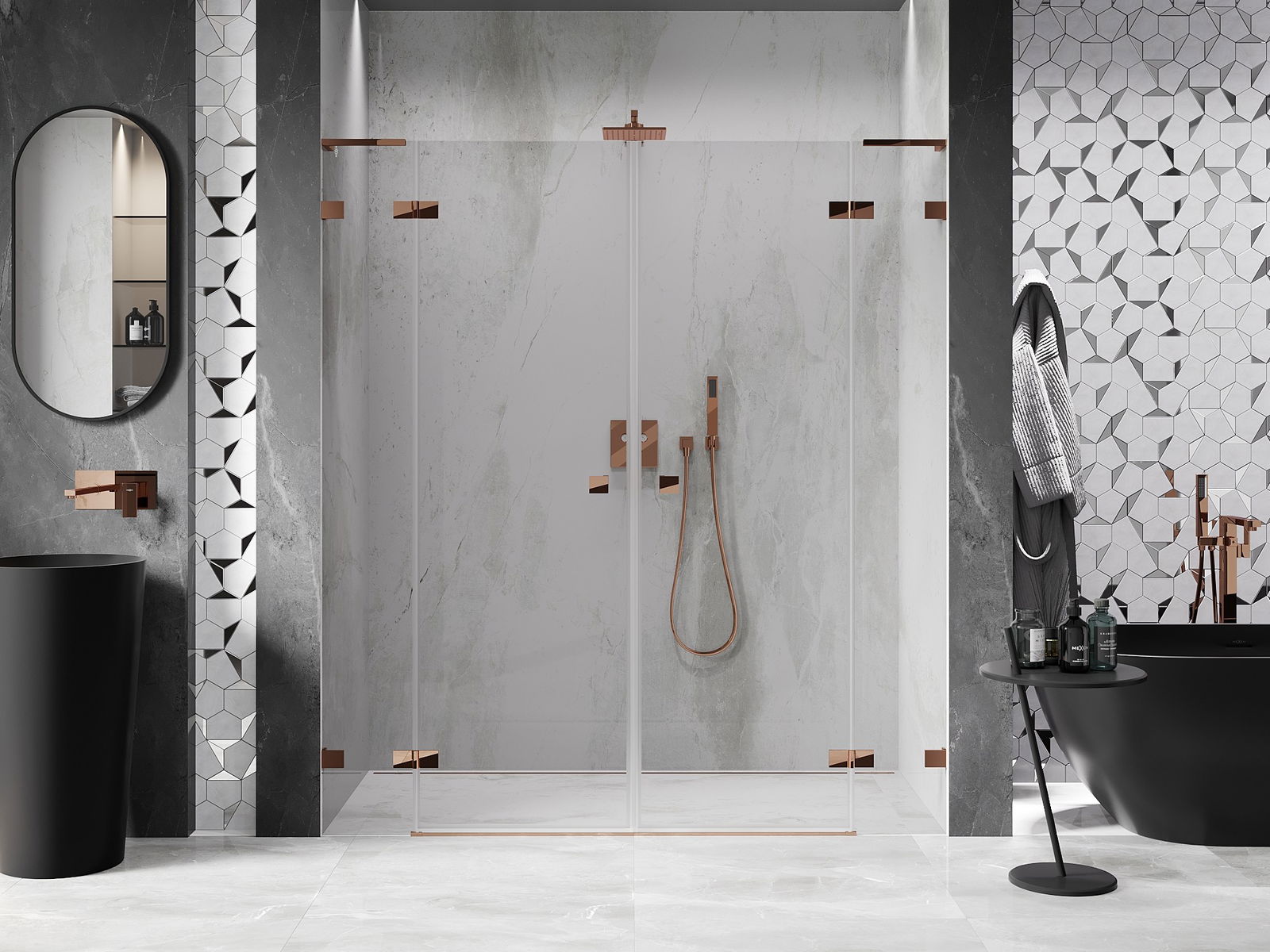 Οι σφιγκτήρες και οι μεντεσέδες είναι κατασκευασμένοι από πολύ ανθεκτικό ορείχαλκο και επιπλέον δημιουργούν μια ευθυγραμμισμένη επιφάνεια γυαλιού. Είναι μια εξαιρετική επιλογή που συνδυάζει κομψότητα, ανθεκτικότητα και σύγχρονο σχεδιασμό. Χάρη σε αυτές τις λύσεις, η ντουζιέρα κερδίζει σε αισθητική και ταυτόχρονα διευκολύνουν τη διατήρηση της καθαριότητας.