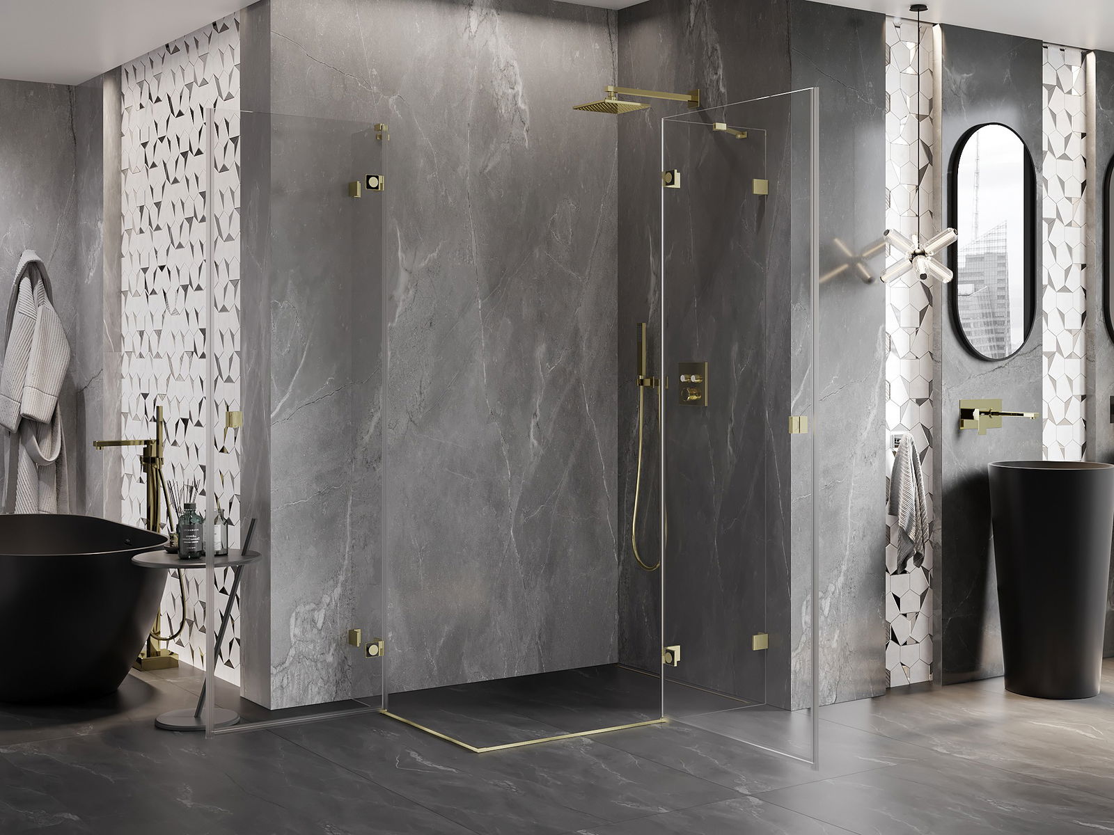 Οι σφιγκτήρες και οι μεντεσέδες είναι κατασκευασμένοι από πολύ ανθεκτικό ορείχαλκο και επιπλέον δημιουργούν μια ευθυγραμμισμένη επιφάνεια γυαλιού. Είναι μια εξαιρετική επιλογή που συνδυάζει κομψότητα, ανθεκτικότητα και σύγχρονο σχεδιασμό. Χάρη σε αυτές τις λύσεις, η ντουζιέρα κερδίζει σε αισθητική και ταυτόχρονα διευκολύνουν τη διατήρηση της καθαριότητας.