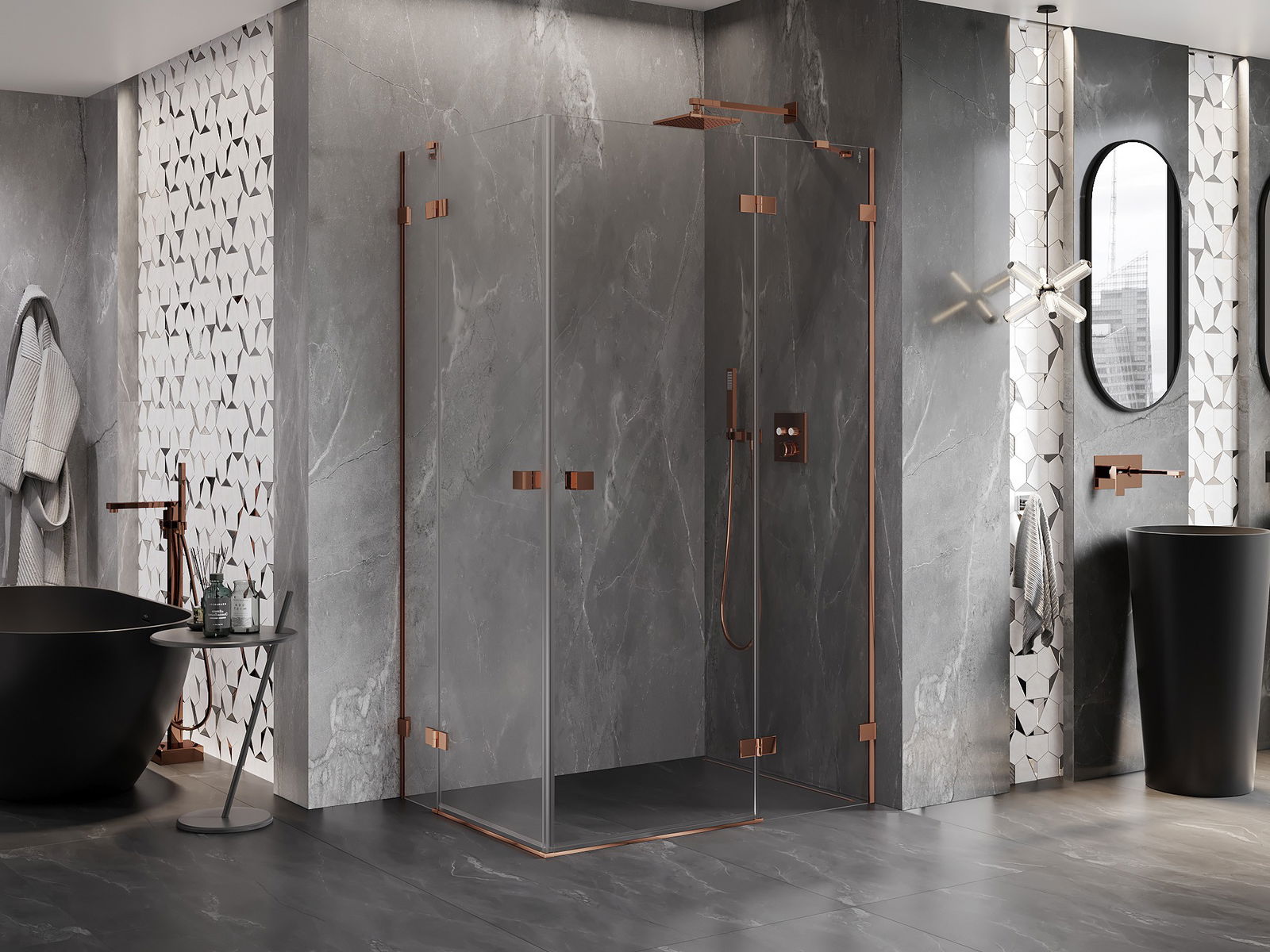 Οι σφιγκτήρες και οι μεντεσέδες είναι κατασκευασμένοι από πολύ ανθεκτικό ορείχαλκο και επιπλέον δημιουργούν μια ευθυγραμμισμένη επιφάνεια γυαλιού. Είναι μια εξαιρετική επιλογή που συνδυάζει κομψότητα, ανθεκτικότητα και σύγχρονο σχεδιασμό. Χάρη σε αυτές τις λύσεις, η ντουζιέρα κερδίζει σε αισθητική και ταυτόχρονα διευκολύνουν τη διατήρηση της καθαριότητας.