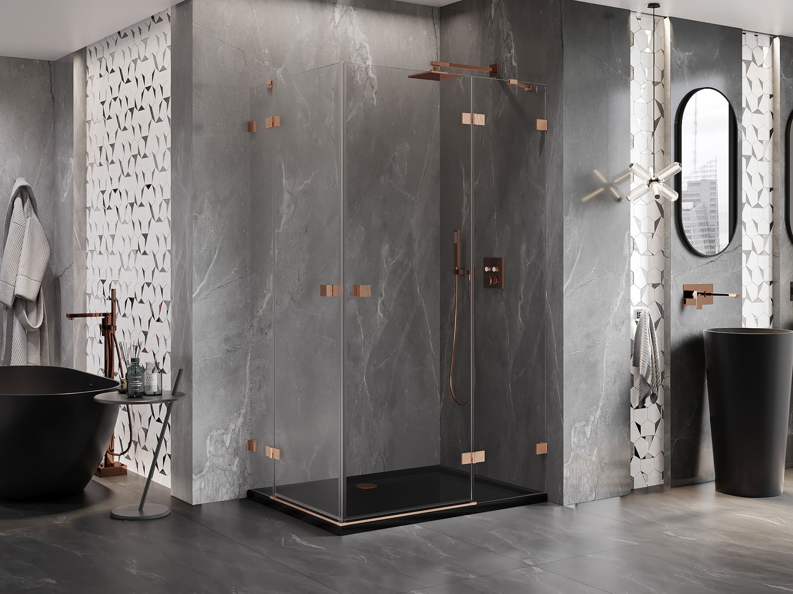 Οι σφιγκτήρες και οι μεντεσέδες είναι κατασκευασμένοι από πολύ ανθεκτικό ορείχαλκο και επιπλέον δημιουργούν μια ευθυγραμμισμένη επιφάνεια γυαλιού. Είναι μια εξαιρετική επιλογή που συνδυάζει κομψότητα, ανθεκτικότητα και σύγχρονο σχεδιασμό. Χάρη σε αυτές τις λύσεις, η ντουζιέρα κερδίζει σε αισθητική και ταυτόχρονα διευκολύνουν τη διατήρηση της καθαριότητας.