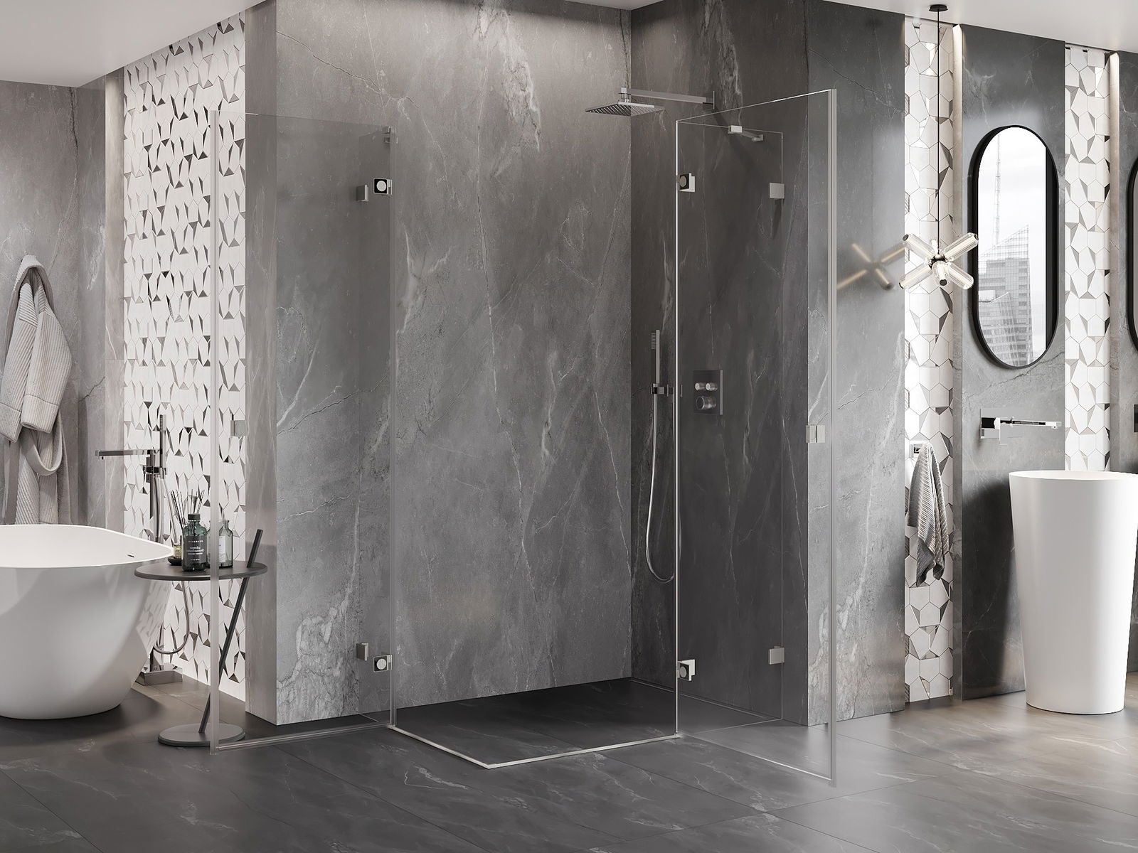 Οι σφιγκτήρες και οι μεντεσέδες είναι κατασκευασμένοι από πολύ ανθεκτικό ορείχαλκο και επιπλέον δημιουργούν μια ευθυγραμμισμένη επιφάνεια γυαλιού. Είναι μια εξαιρετική επιλογή που συνδυάζει κομψότητα, ανθεκτικότητα και σύγχρονο σχεδιασμό. Χάρη σε αυτές τις λύσεις, η ντουζιέρα κερδίζει σε αισθητική και ταυτόχρονα διευκολύνουν τη διατήρηση της καθαριότητας.
