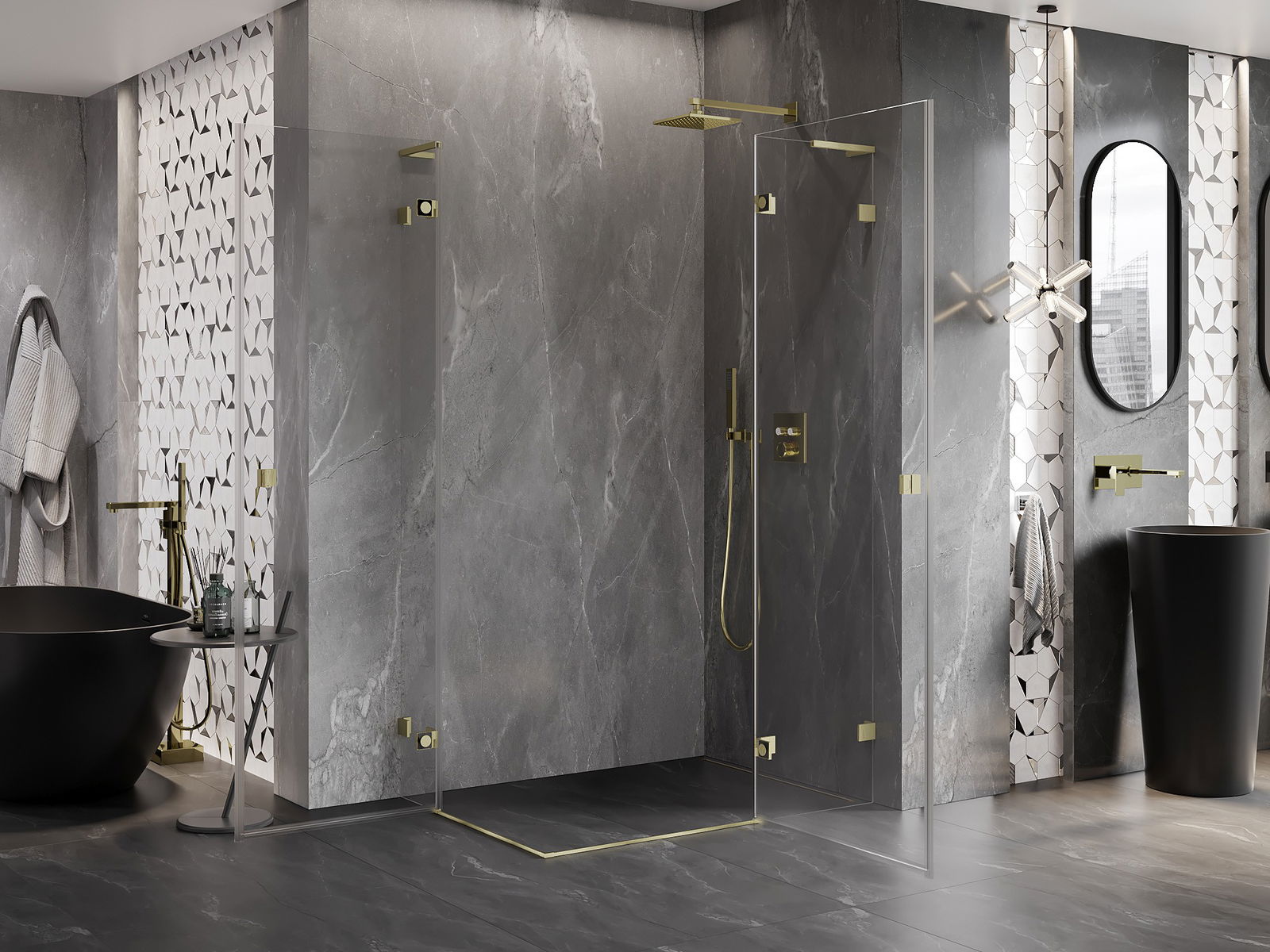 Οι σφιγκτήρες και οι μεντεσέδες είναι κατασκευασμένοι από πολύ ανθεκτικό ορείχαλκο και επιπλέον δημιουργούν μια ευθυγραμμισμένη επιφάνεια γυαλιού. Είναι μια εξαιρετική επιλογή που συνδυάζει κομψότητα, ανθεκτικότητα και σύγχρονο σχεδιασμό. Χάρη σε αυτές τις λύσεις, η ντουζιέρα κερδίζει σε αισθητική και ταυτόχρονα διευκολύνουν τη διατήρηση της καθαριότητας.