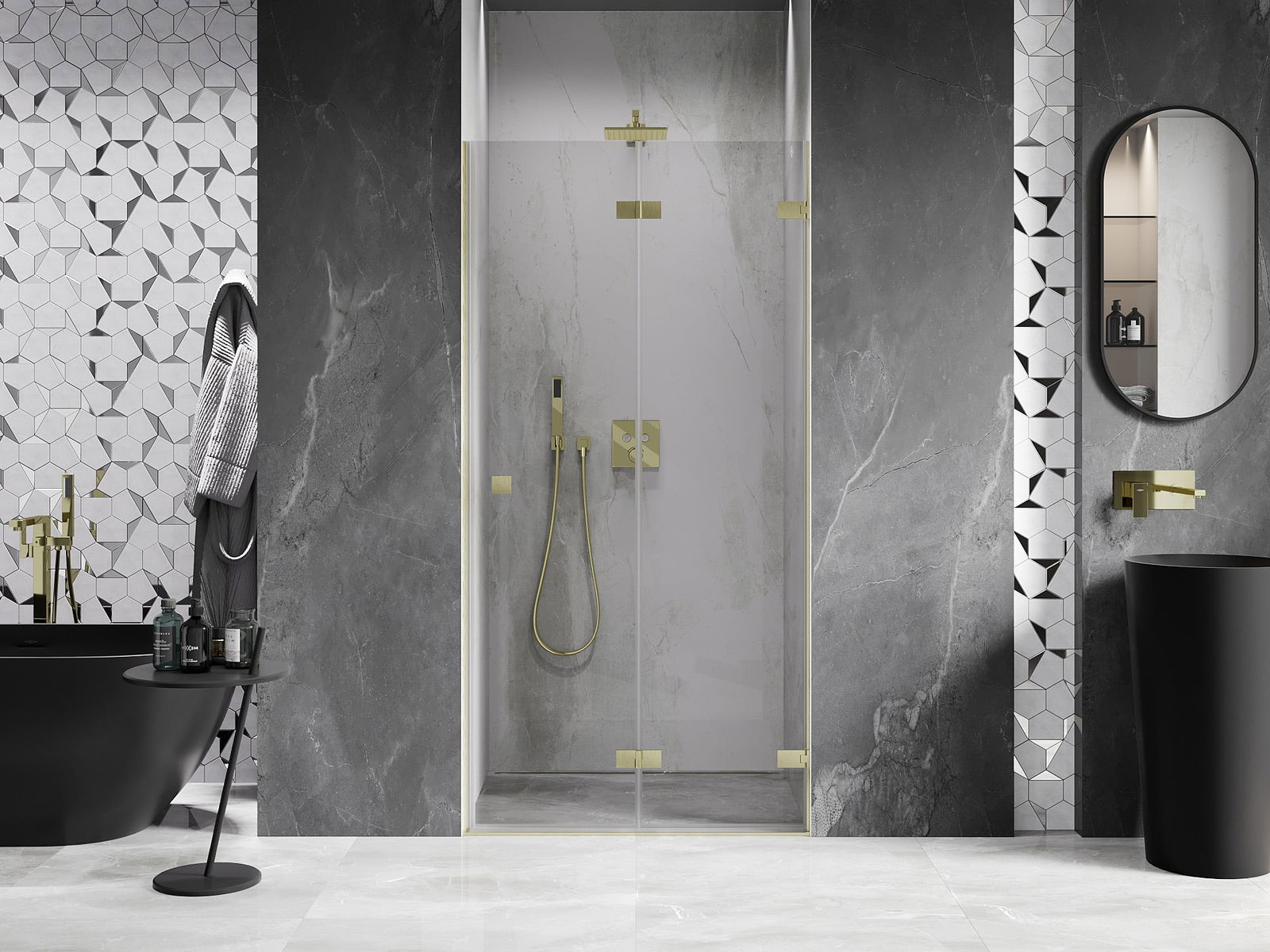 Οι σφιγκτήρες και οι μεντεσέδες είναι κατασκευασμένοι από πολύ ανθεκτικό ορείχαλκο και επιπλέον δημιουργούν μια ευθυγραμμισμένη επιφάνεια γυαλιού. Είναι μια εξαιρετική επιλογή που συνδυάζει κομψότητα, ανθεκτικότητα και σύγχρονο σχεδιασμό. Χάρη σε αυτές τις λύσεις, η ντουζιέρα κερδίζει σε αισθητική και ταυτόχρονα διευκολύνουν τη διατήρηση της καθαριότητας.