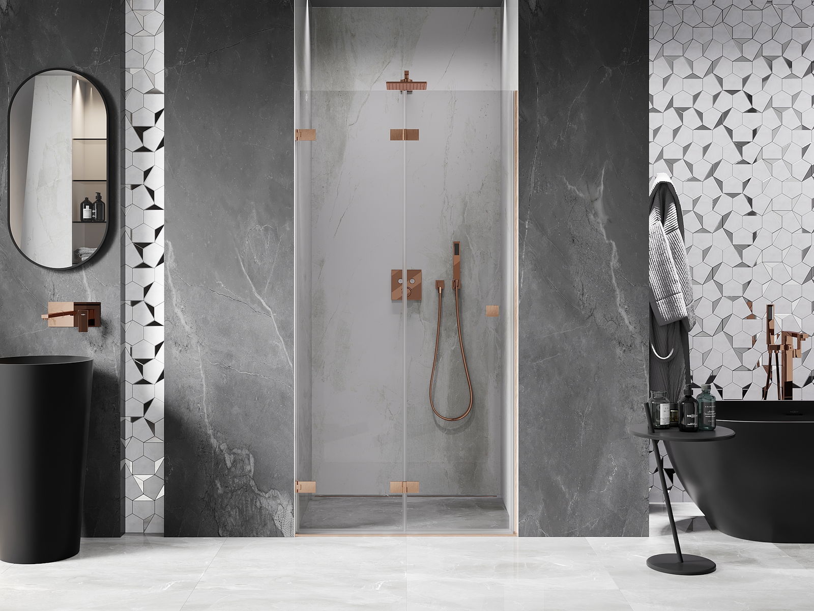 Οι σφιγκτήρες και οι μεντεσέδες είναι κατασκευασμένοι από πολύ ανθεκτικό ορείχαλκο και επιπλέον δημιουργούν μια ευθυγραμμισμένη επιφάνεια γυαλιού. Είναι μια εξαιρετική επιλογή που συνδυάζει κομψότητα, ανθεκτικότητα και σύγχρονο σχεδιασμό. Χάρη σε αυτές τις λύσεις, η ντουζιέρα κερδίζει σε αισθητική και ταυτόχρονα διευκολύνουν τη διατήρηση της καθαριότητας.