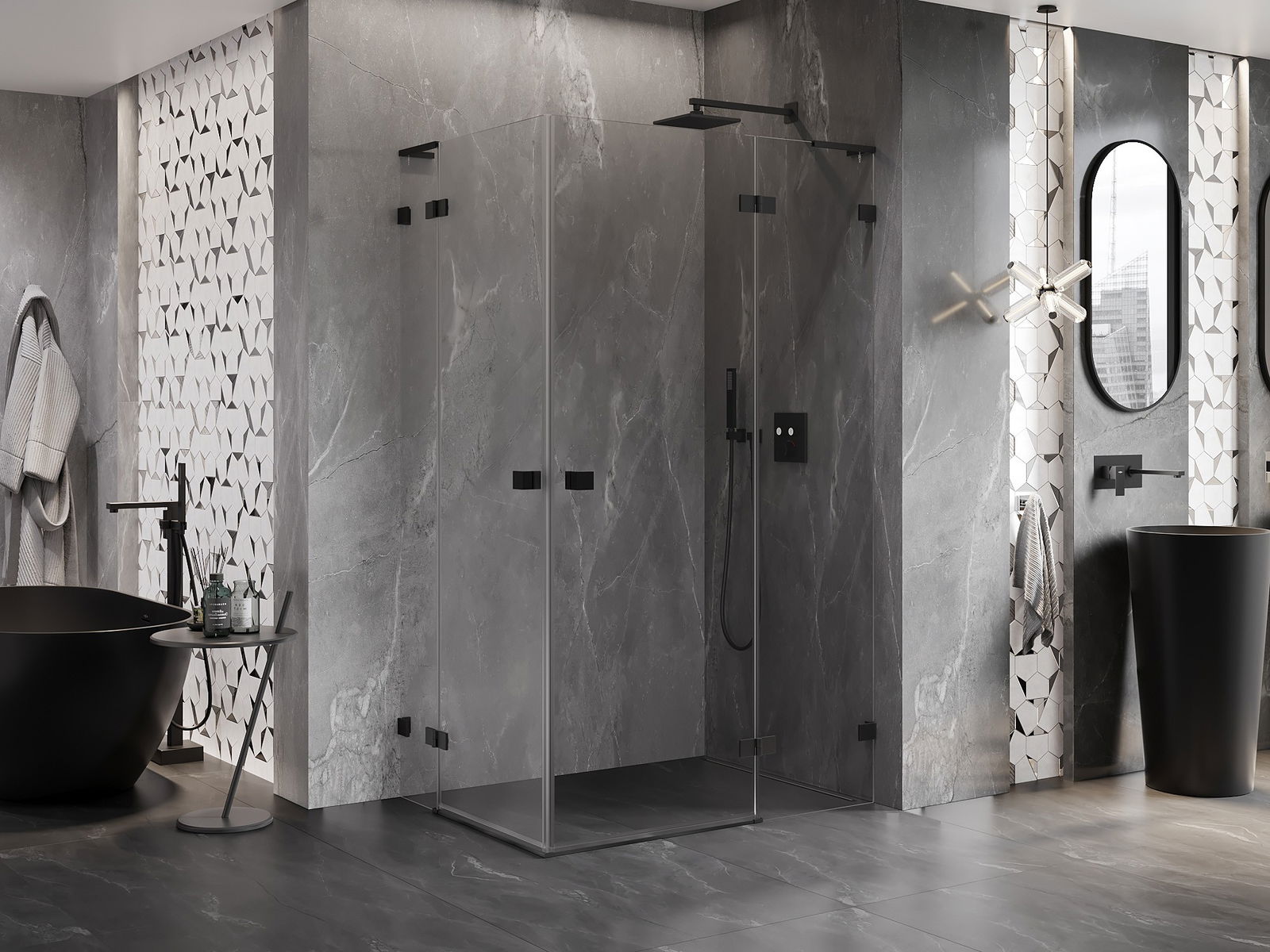 Οι σφιγκτήρες και οι μεντεσέδες είναι κατασκευασμένοι από πολύ ανθεκτικό ορείχαλκο και επιπλέον δημιουργούν μια ευθυγραμμισμένη επιφάνεια γυαλιού. Είναι μια εξαιρετική επιλογή που συνδυάζει κομψότητα, ανθεκτικότητα και σύγχρονο σχεδιασμό. Χάρη σε αυτές τις λύσεις, η ντουζιέρα κερδίζει σε αισθητική και ταυτόχρονα διευκολύνουν τη διατήρηση της καθαριότητας.