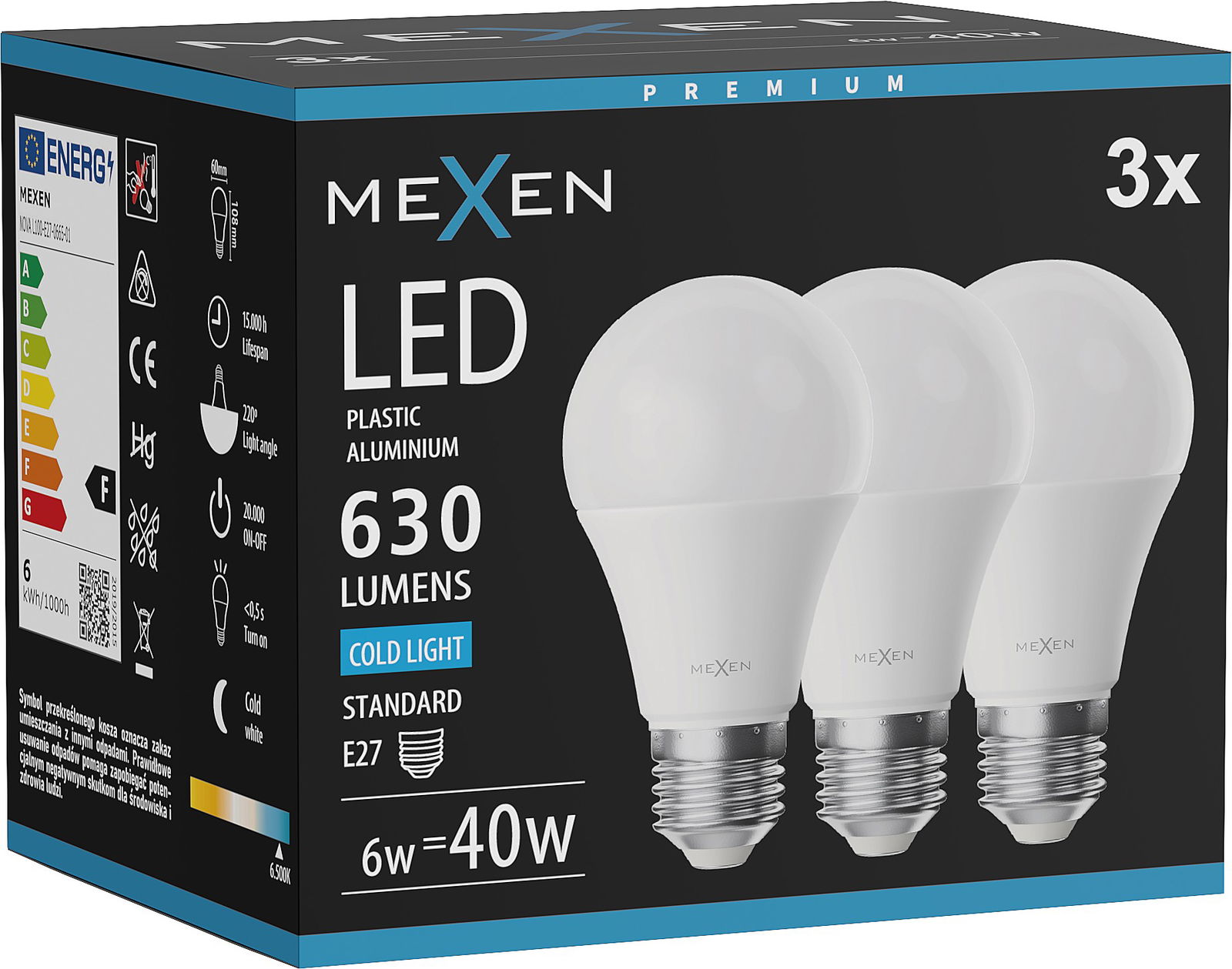 Mexen Nova 3x Λαμπτήρας LED E27, A60, 6W, Ψυχρό - 6500K, 630 lm - L100-E27-0665-01x03