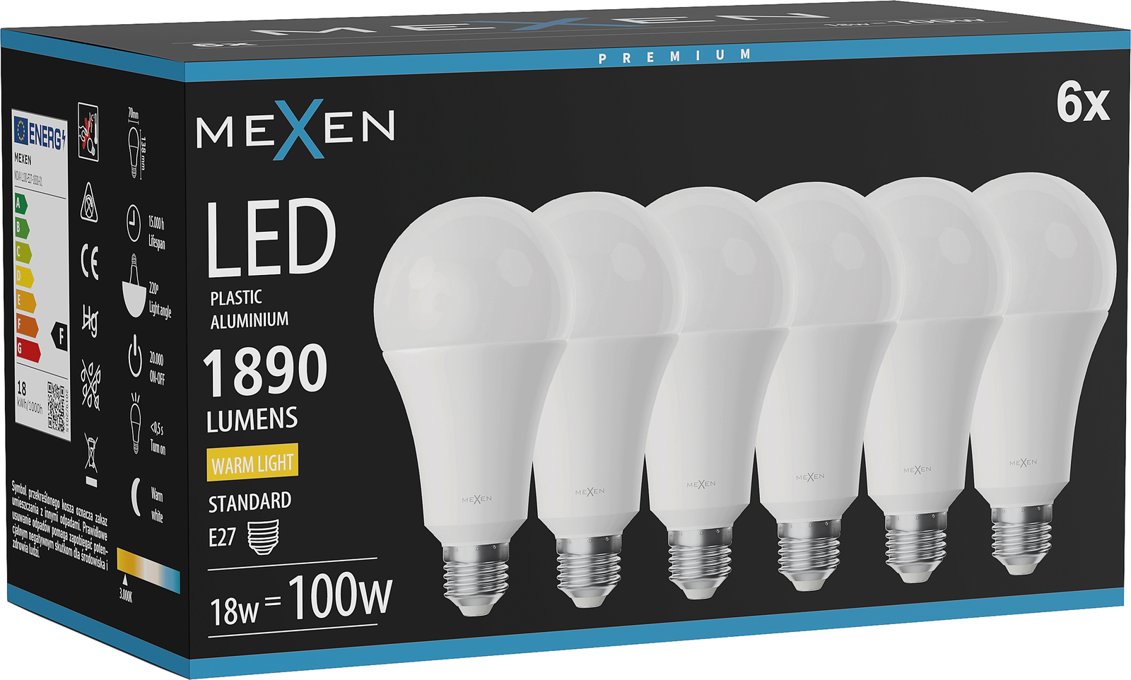 Mexen Nova 6x LED Λάμπα E27, A70, 18W, Θερμή - 3000K, 1890 lm - L100-E27-1830-01x06