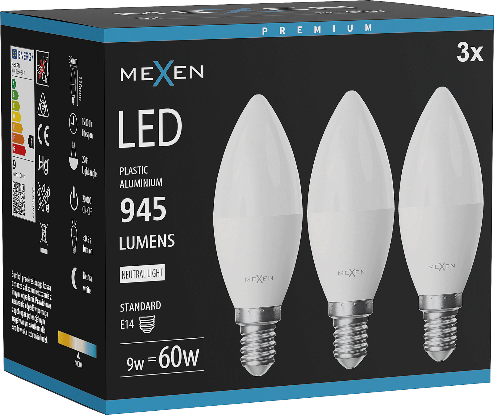 Mexen Nova 3x Λαμπτήρας LED E14, C37, 9W, Ουδέτερη - 4000K, 945 lm - L102-E14-0940-01x03
