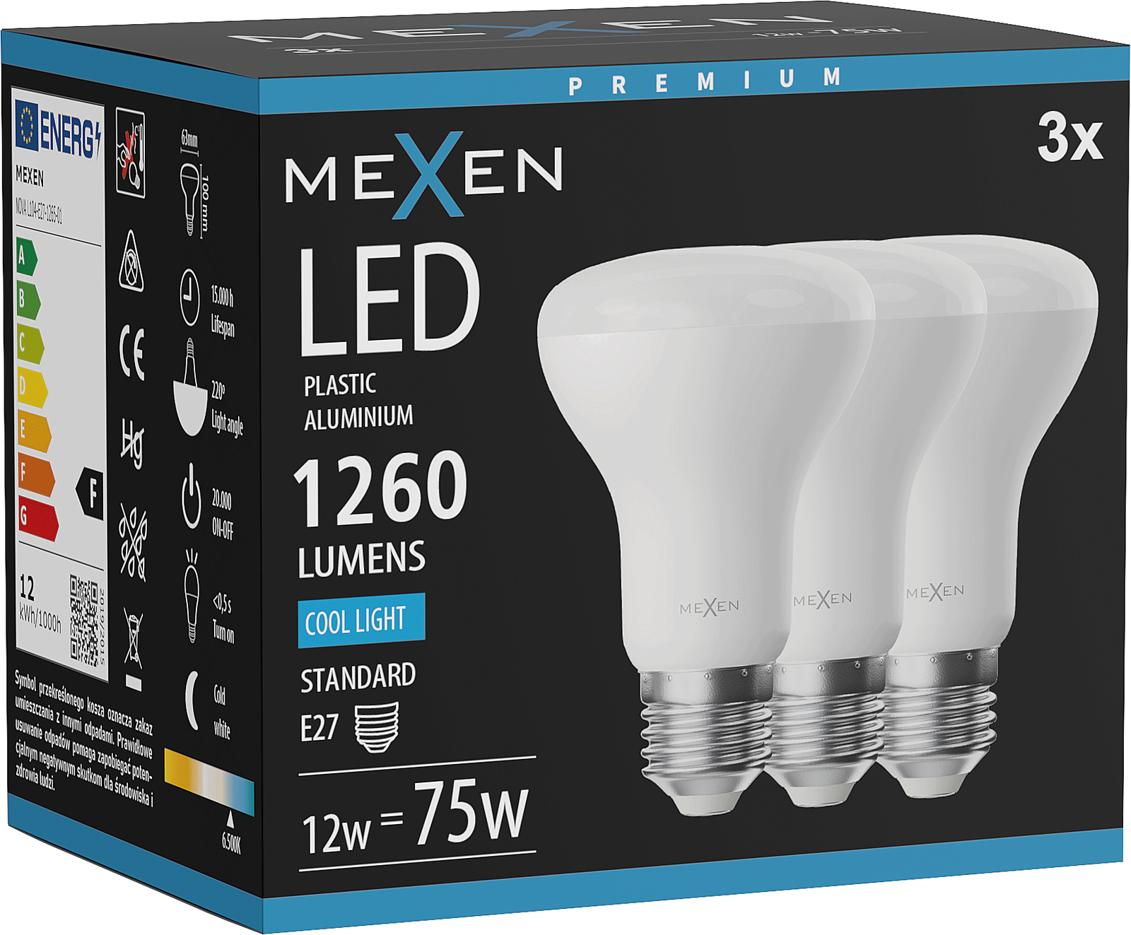 Mexen Nova 3x Λάμπα LED E27, R63, 12W, Ψυχρό - 6500K, 1260 lm - L104-E27-1265-01x03